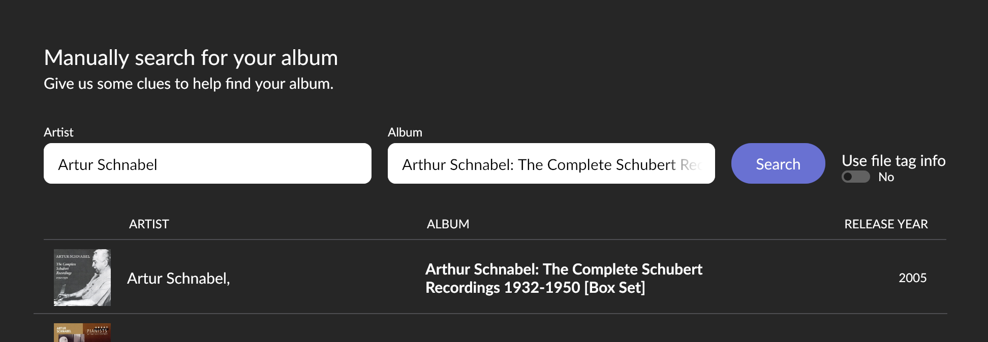 Select “None of these look right” on the “Automatically detecting your album page”, then enter the following search terms for artist and album: