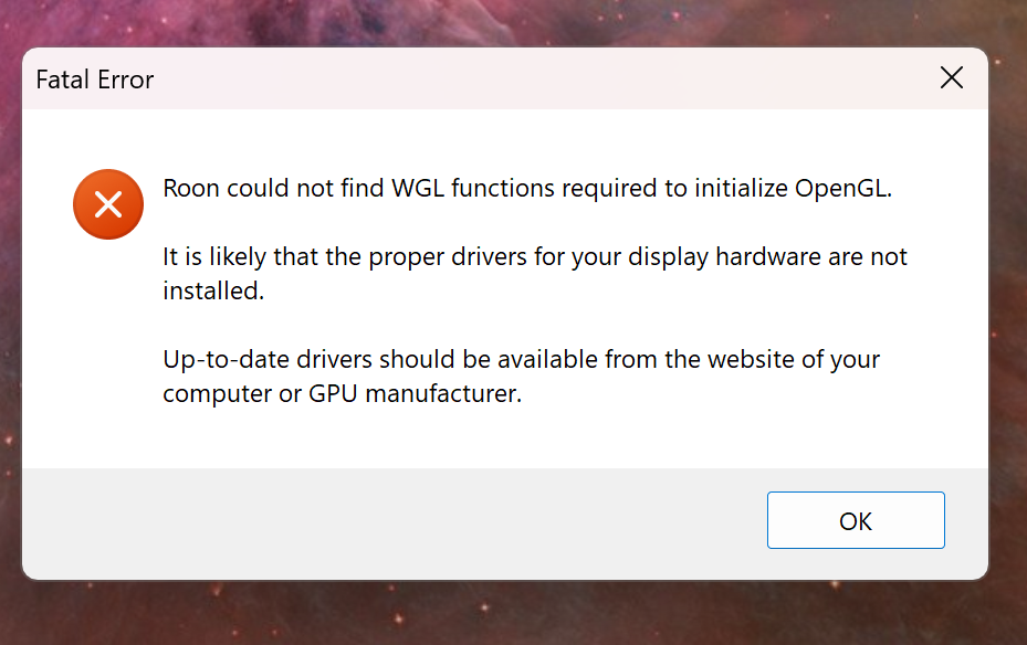 using Surface Pro 11 purchased in 9/25 and installed all recent Microsoft updates through 2/26/26 graphics chip is Qualcomm Adreno x1 85 gpu and downloaded and installed most recent driver from Qualcomm's website Restarted Surface after download and install of driver. Then downloaded and installed Roon. After starting Roon received the error message.
