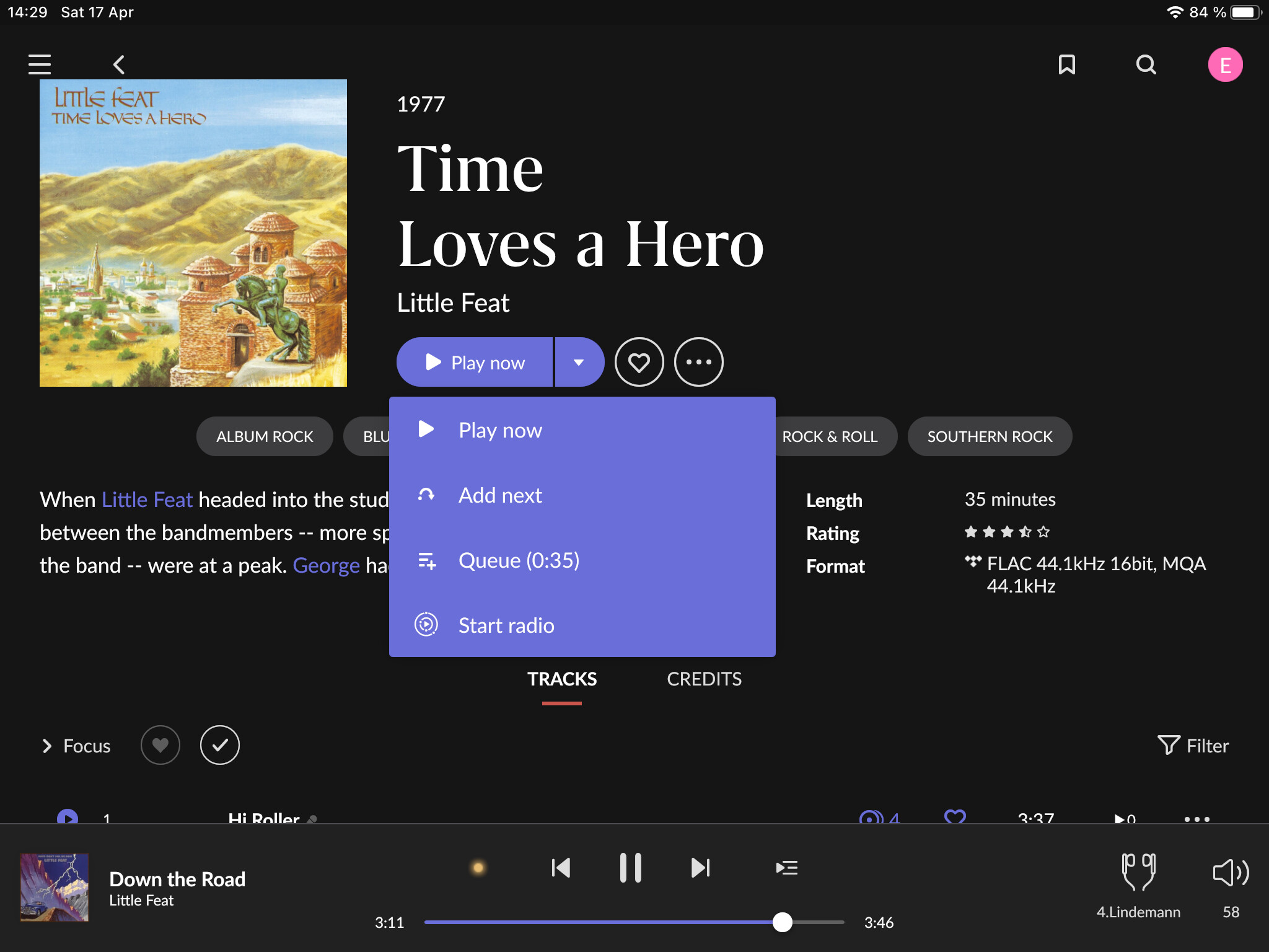 - Starting to play the album after the last track in the queue finishes (Queue - finishing time is shown)