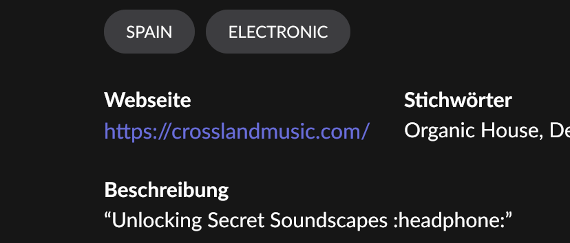 Cross Land Music ist ein junges, dynamisches Label aus Spanien, das sich in kurzer Zeit als Anlaufstelle für Organic- & Deep-House-Liebhaber:innen etabliert hat. Mit internationalen Artists, einem klaren musikalischen Profil und einer wachsenden Online-Community entwickelt es sich stetig weiter – ganz im Zeichen atmosphärischer, organischer Clubmusik.