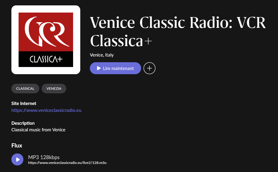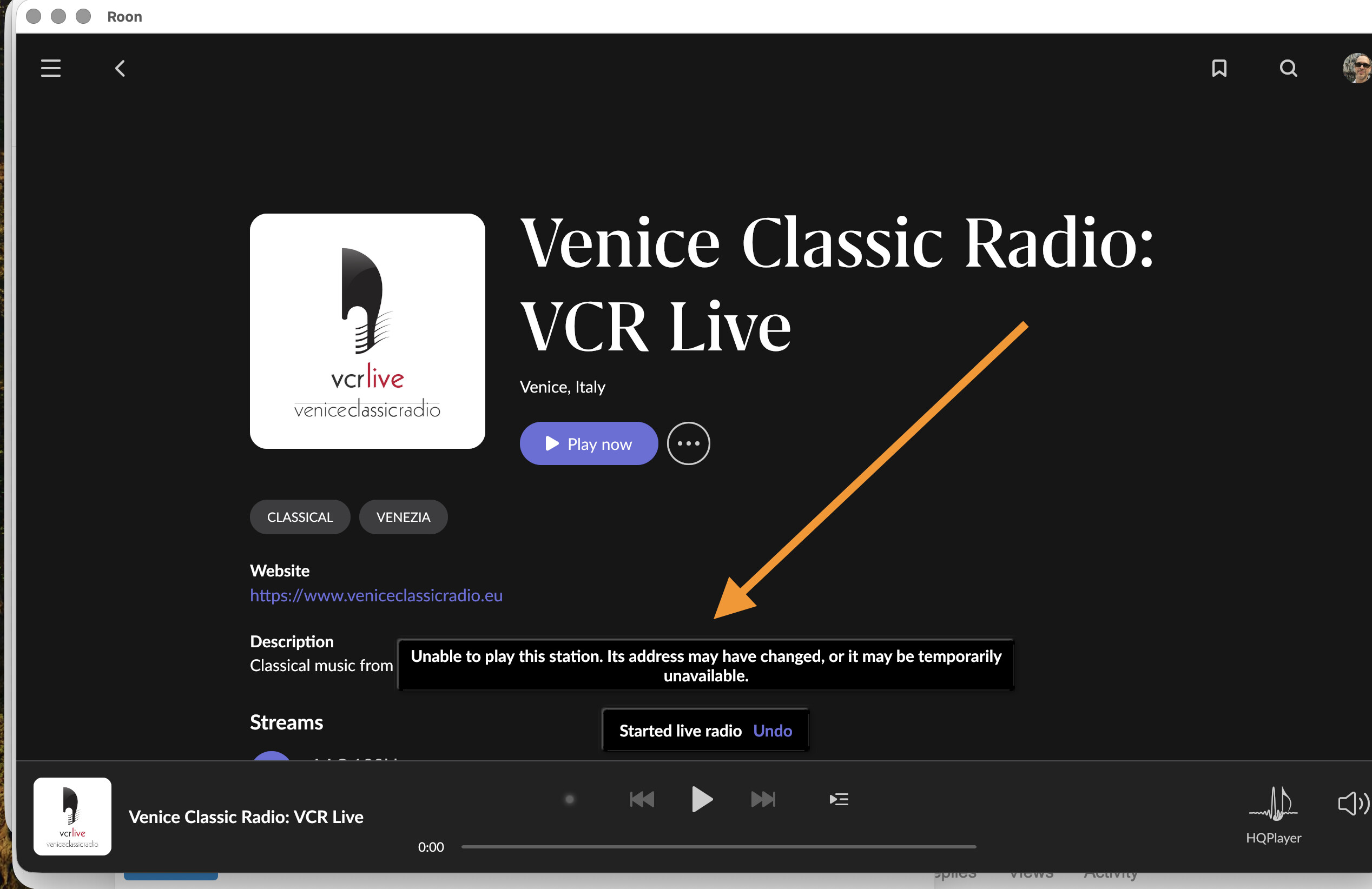 Hi, it appears the station Venice Classic Radio: VCR Live may no longer exist (see pic)… or it may have been changed to “VCR Classica+” which can be accessed at the following link: https://www.veniceclassicradio.eu/.