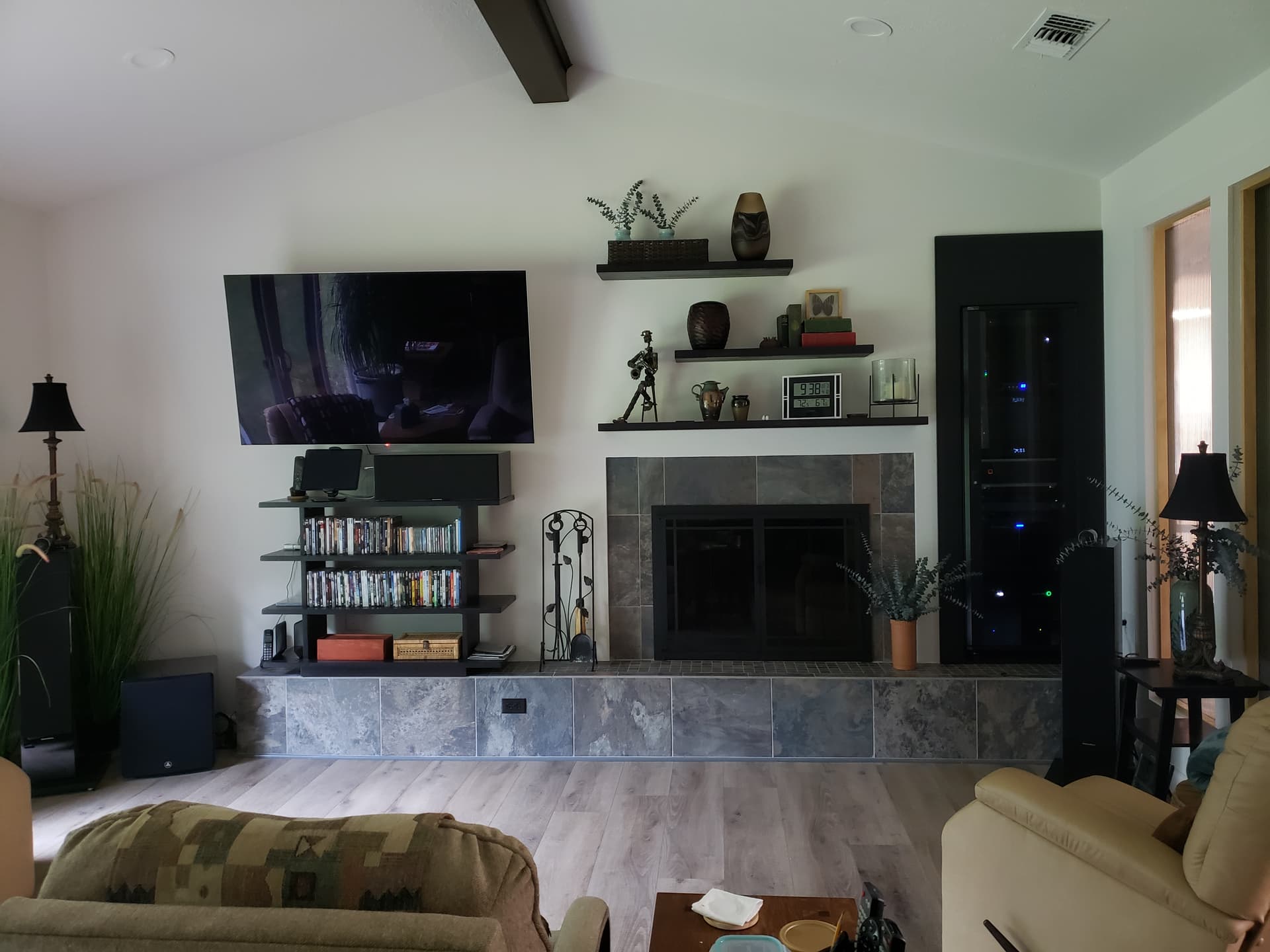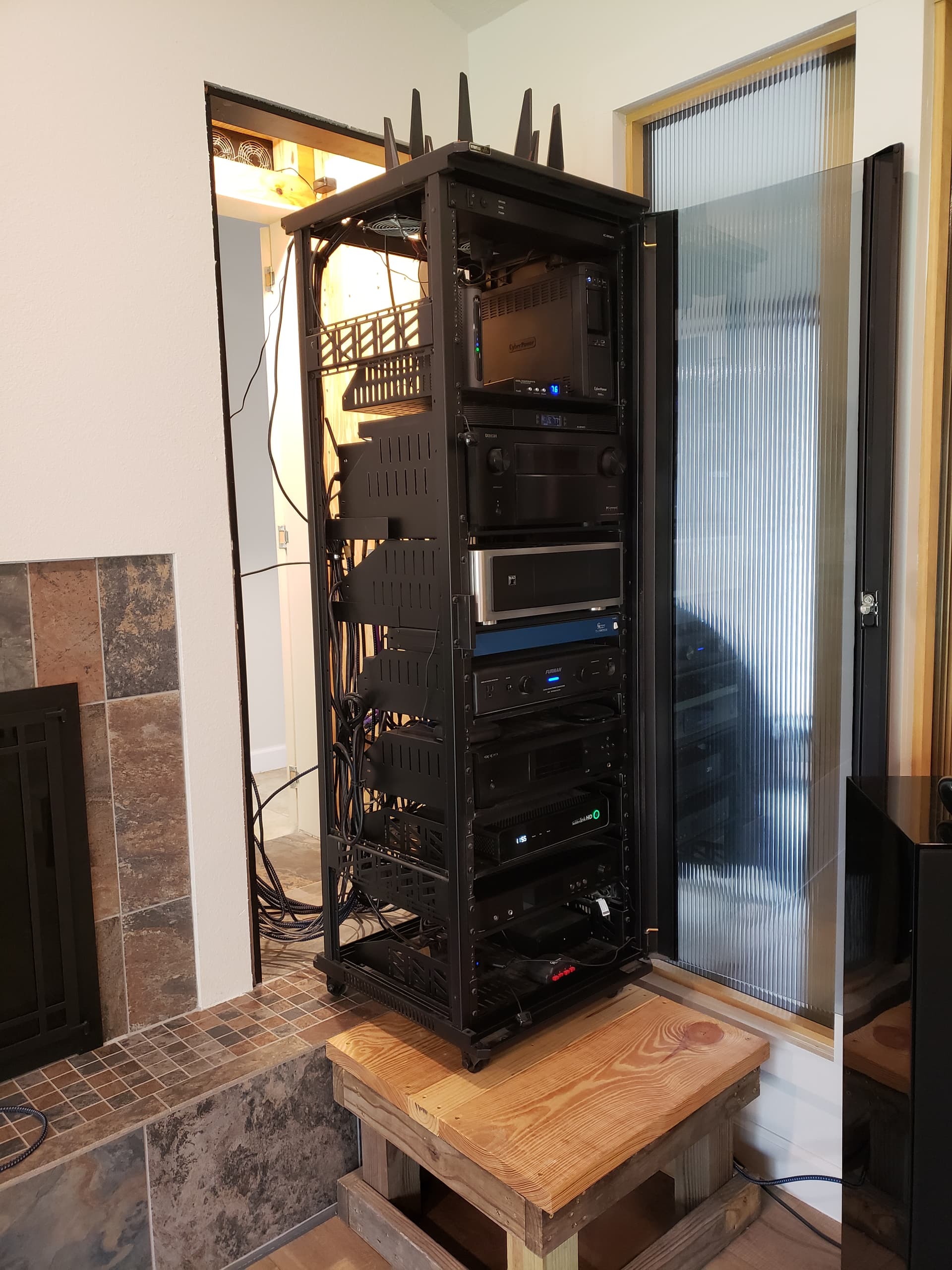 This is my remodeled living room media space for home theater and music. The Media closet is climate controlled as well as the enclosed cabinet. Temp in the cabinet with the panels in place and glass door closed and equipment on and producing heat stays around 85 degrees. Rear door added to the closet for quick access when needed. With the 1’ deep hearth I had to build a sturdy platform to support the 6 to 8 hundred LB weight of the loaded cabinet when rolled out for servicing.