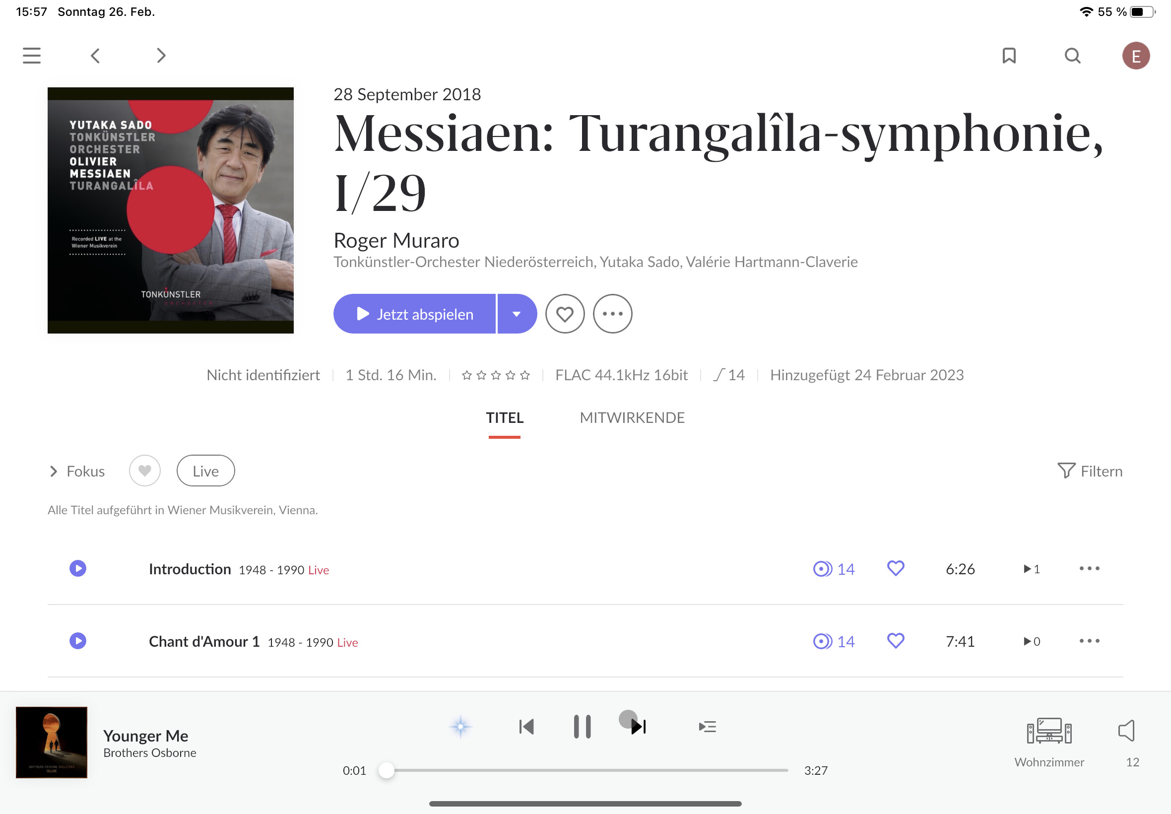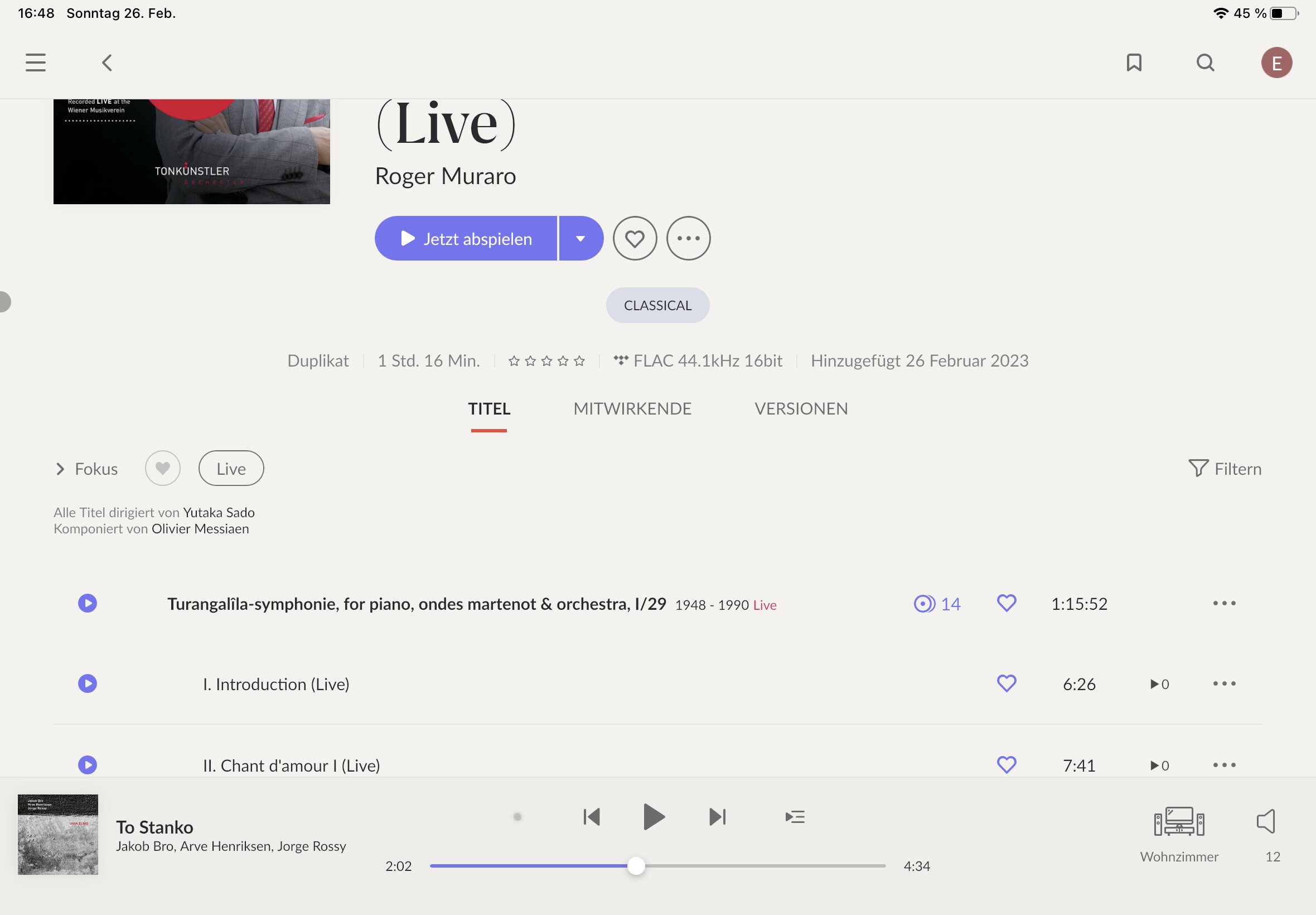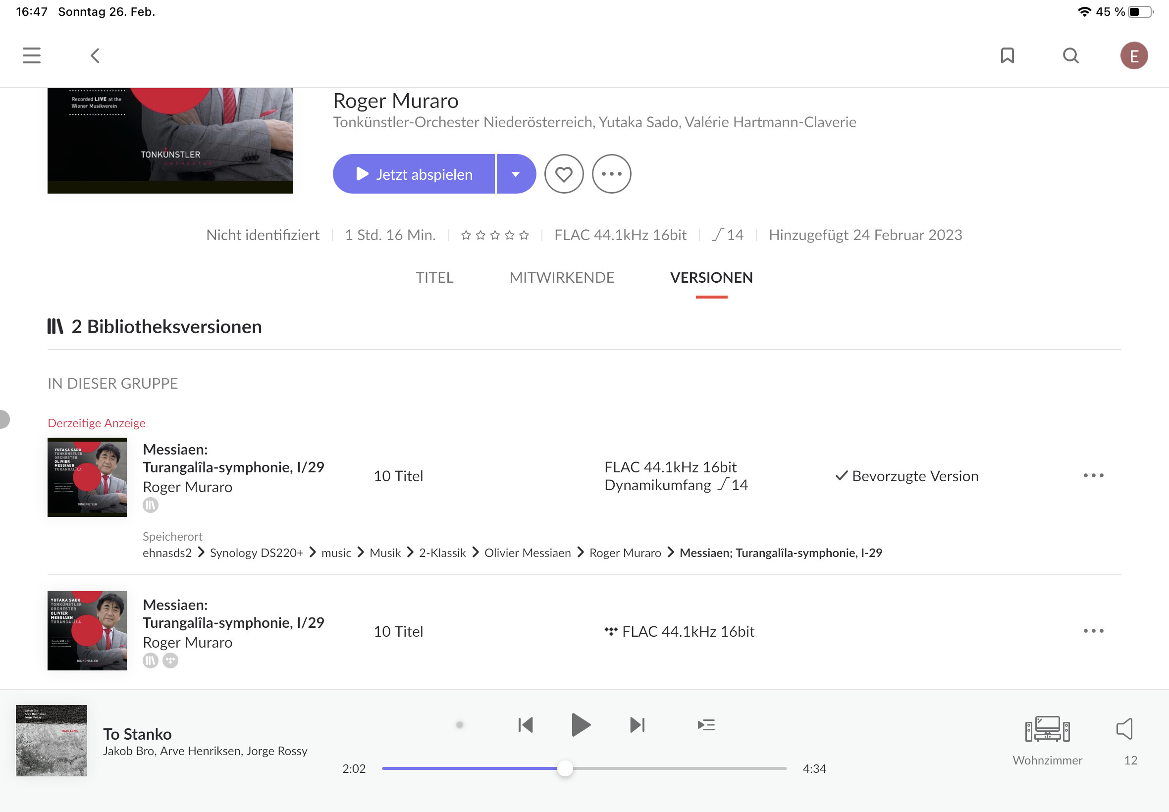 I was trying to add the following album to roon: Yutaka Sado conducting the Tonkünstler-Orchestra with Roger Muraro and Valérie Hartmann-Cláviere of Olivier Messiaen‘s Turangalila-symphonie, recorded in 2018 (screenshots below).