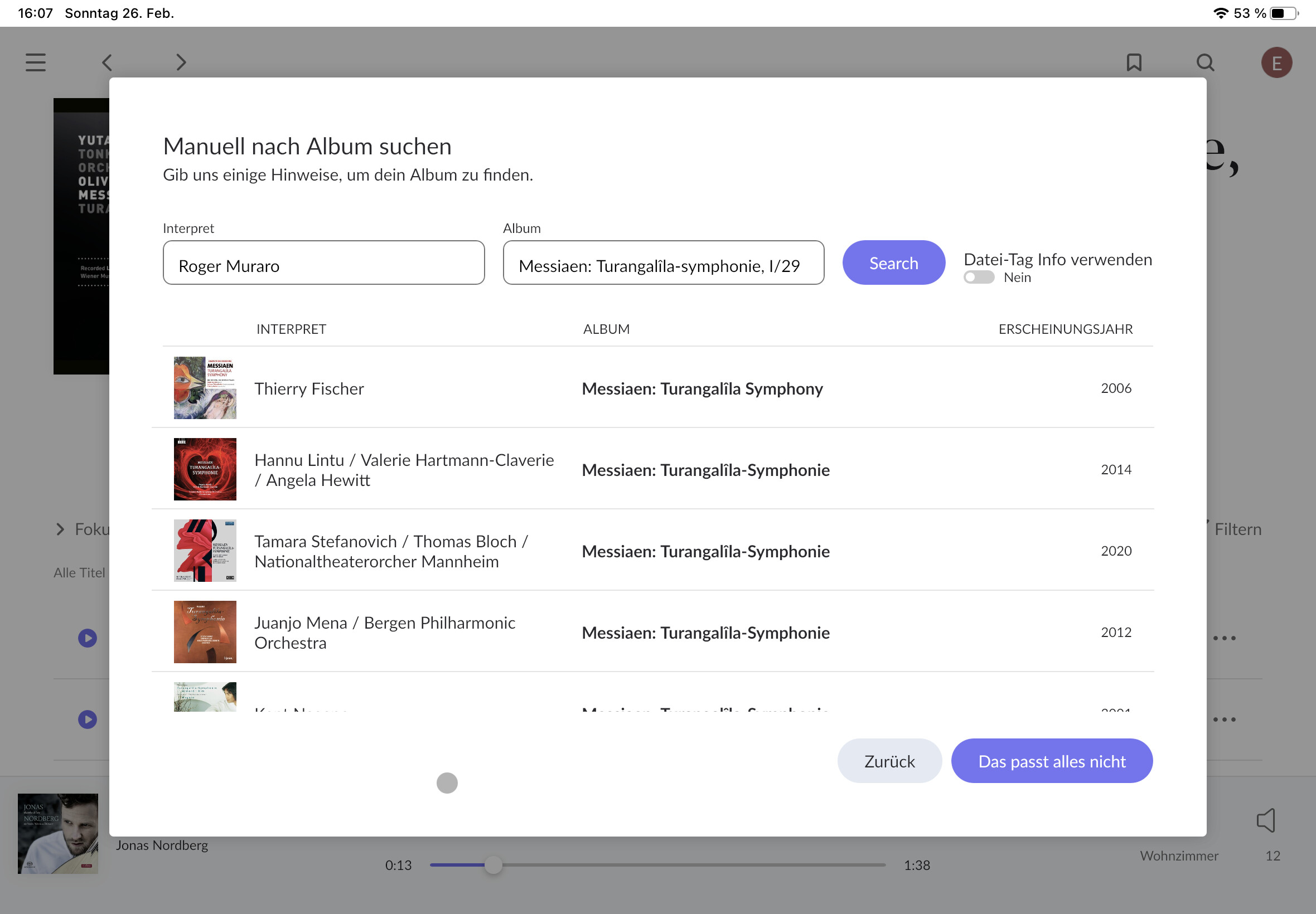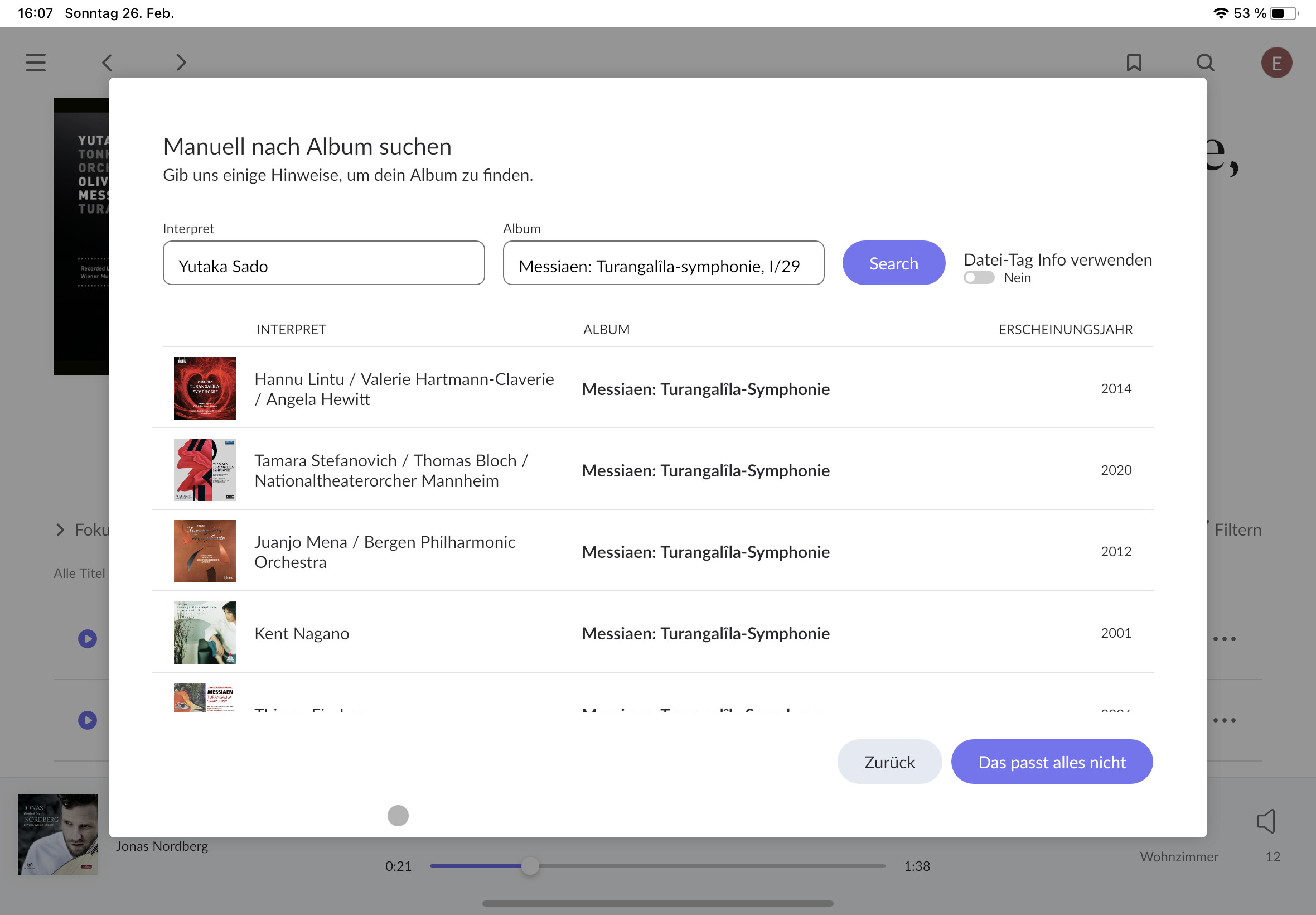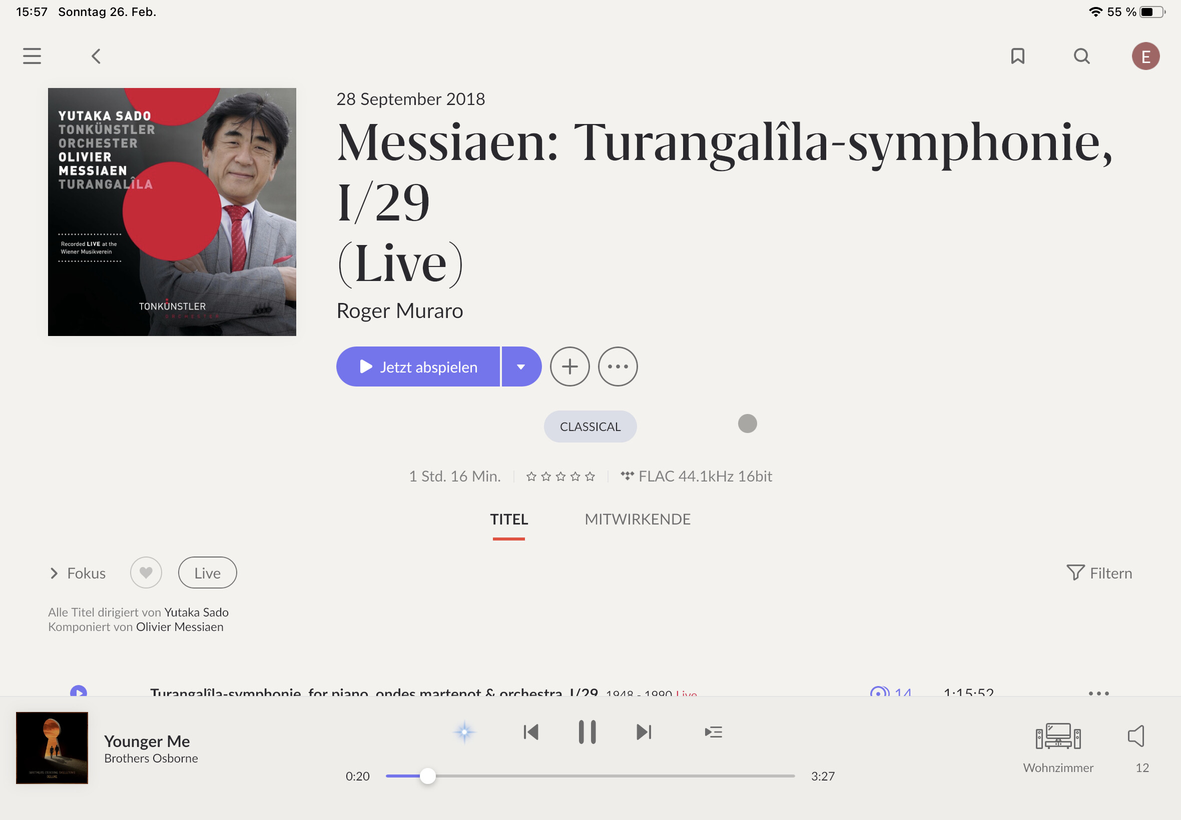 I was trying to add the following album to roon: Yutaka Sado conducting the Tonkünstler-Orchestra with Roger Muraro and Valérie Hartmann-Cláviere of Olivier Messiaen‘s Turangalila-symphonie, recorded in 2018 (screenshots below).