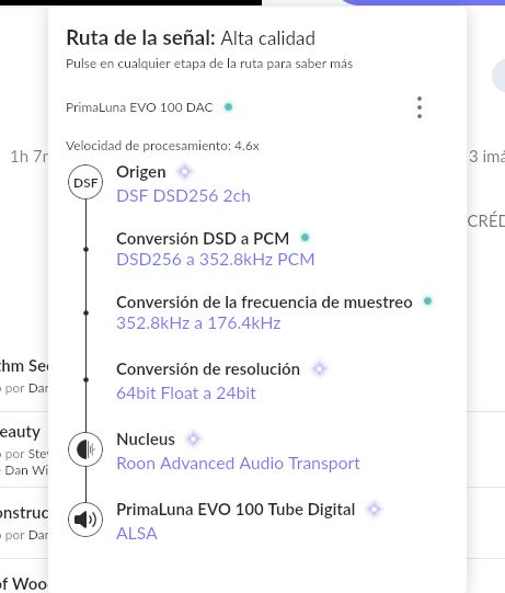 I send you the path of a DSD256 reproduction, and the image of the DAC configuration in Roon. With this configuration the system works properly for a year.