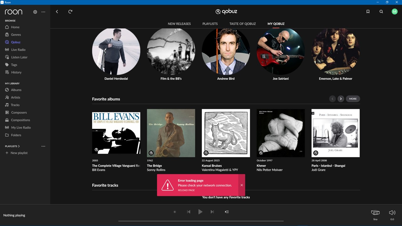 I have just received a Nucleus One and set it up with Qobuz, which I have been using on a PC successfully for some time now. In the Nucleus, it will not show me Qobuz track favorites. It shows Artists and Albums, but says no favorite tracks, which I have many. When I click on My Qobuz, I get error loading page, check network connection, which is clearly fine, since I am getting Artists and Albums. Appreciate any help. I reset the DB and re-downloaded the software, with no fix to the issue. Thanks.