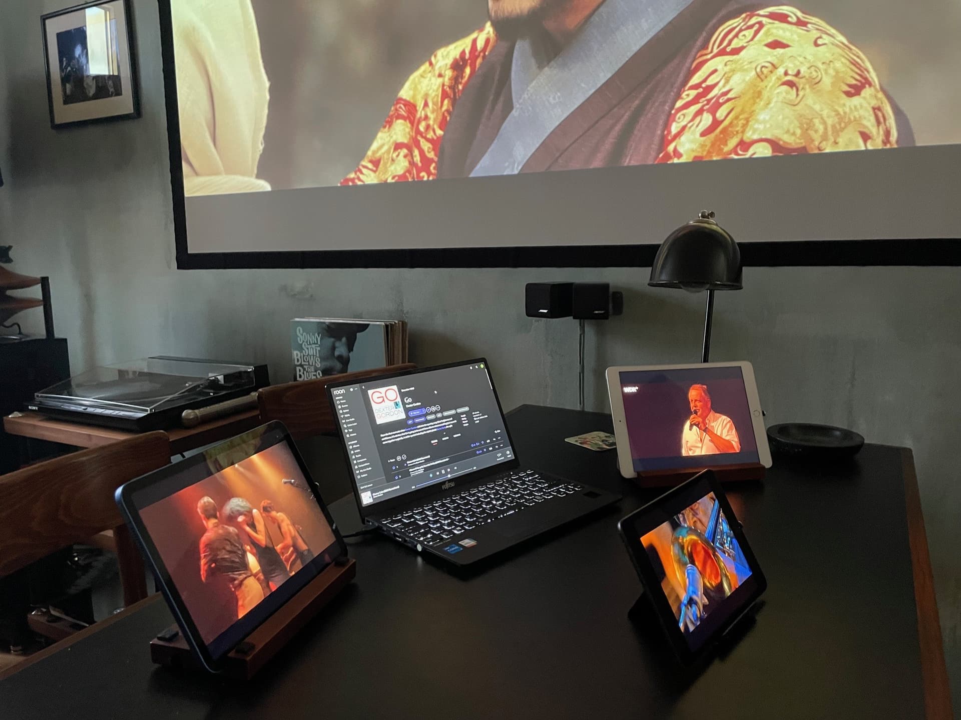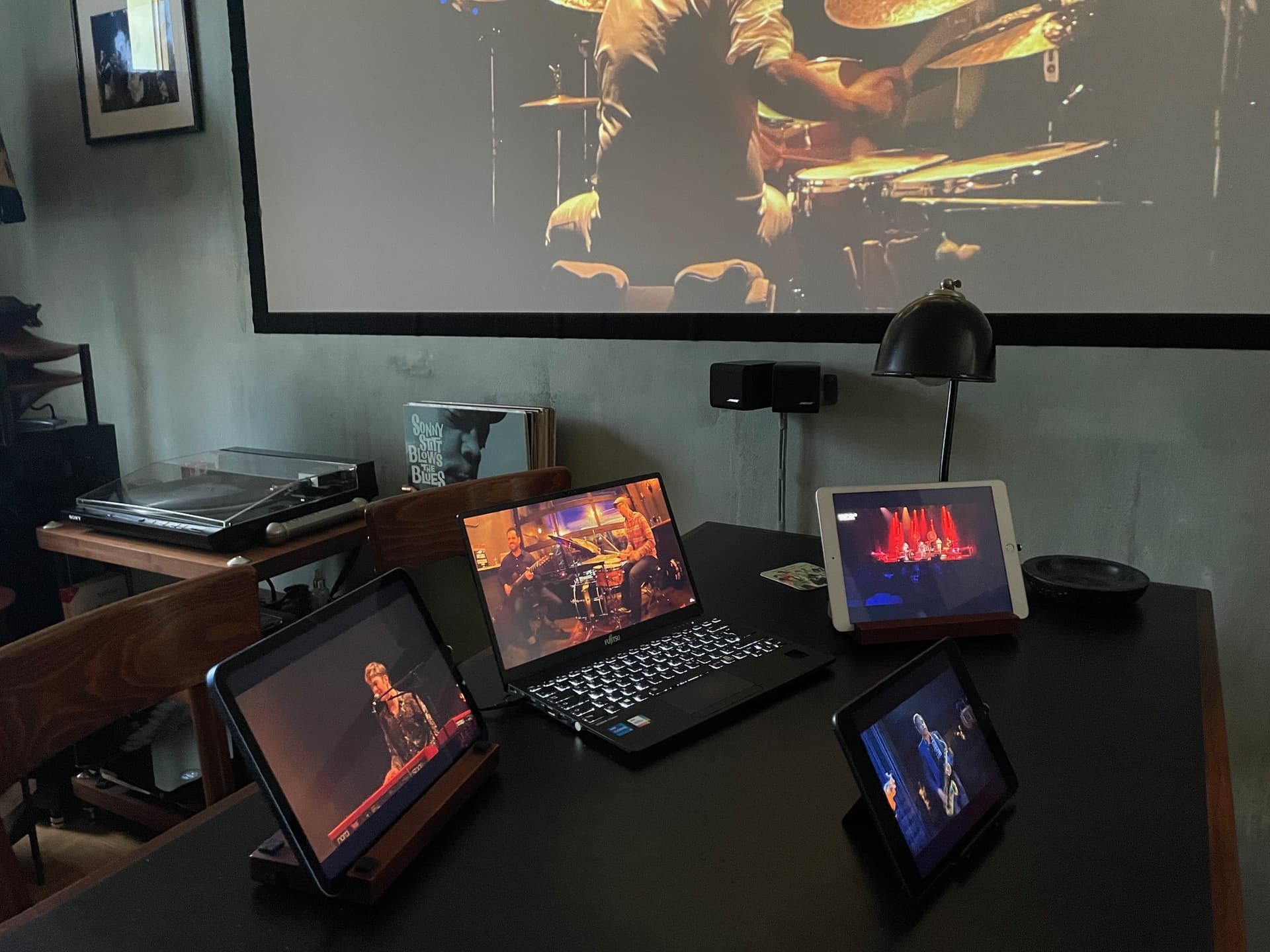 Roon remote on laptop with 192kHz 24bit stream, the iPads running HD videos and the beamer video from FireTV Stick: