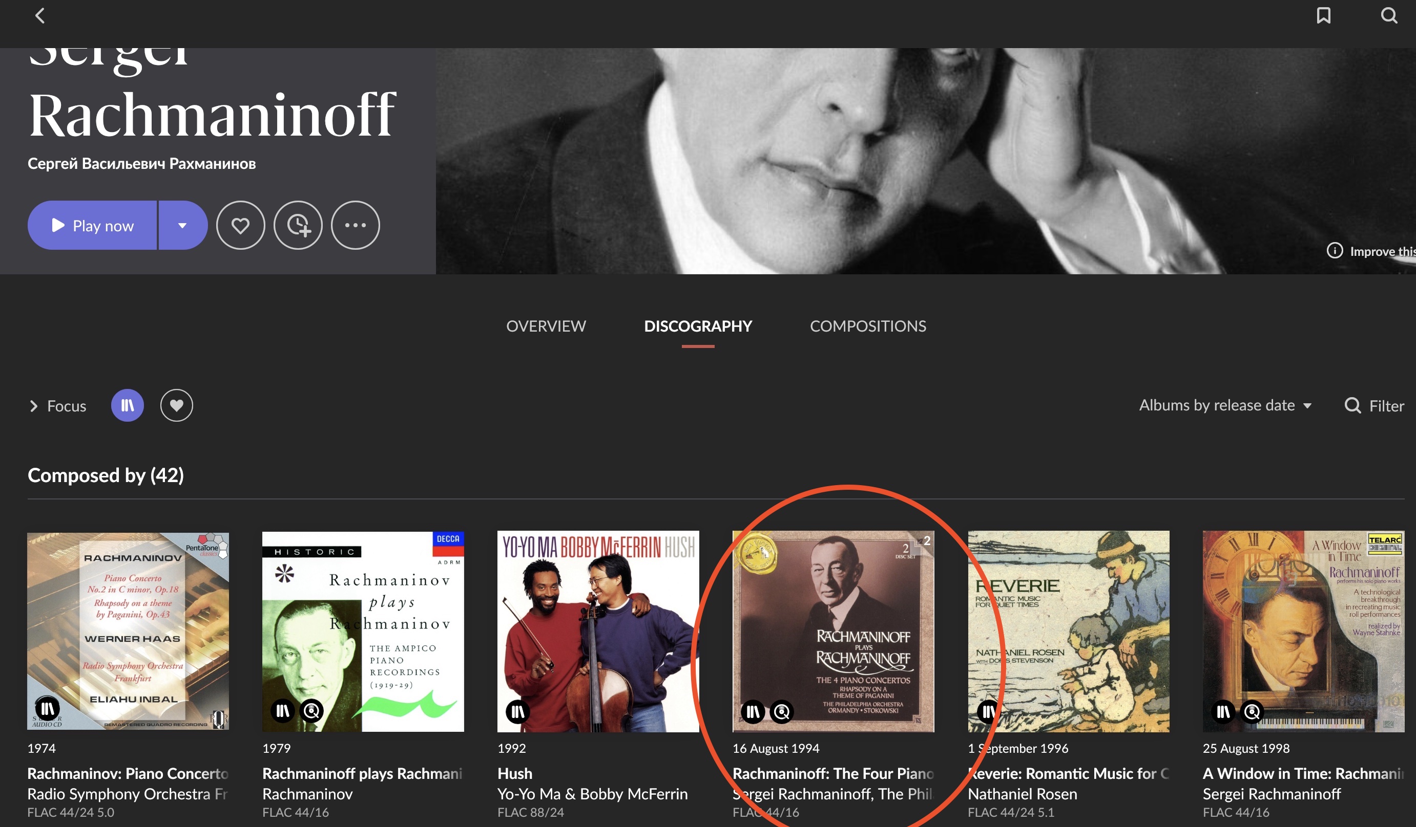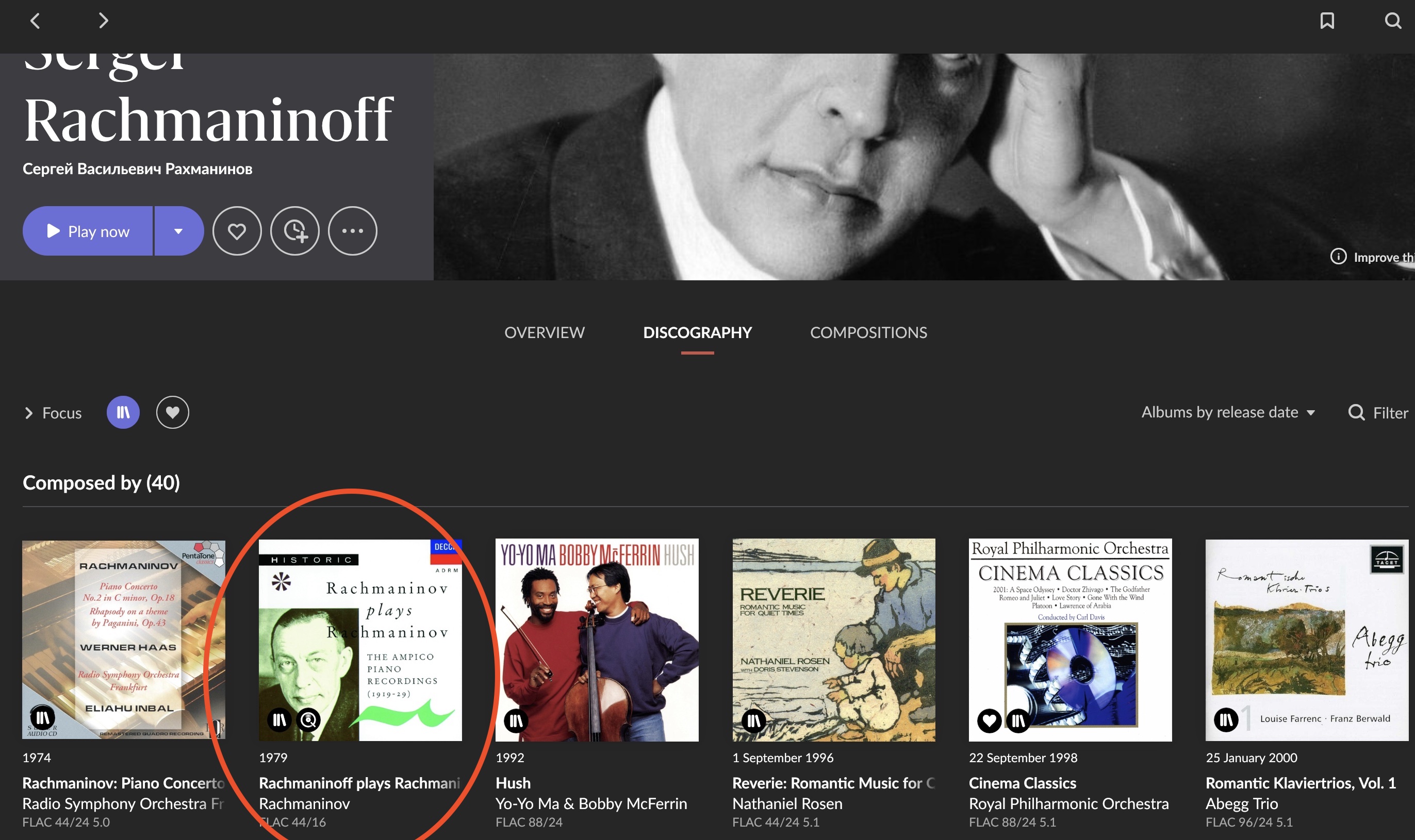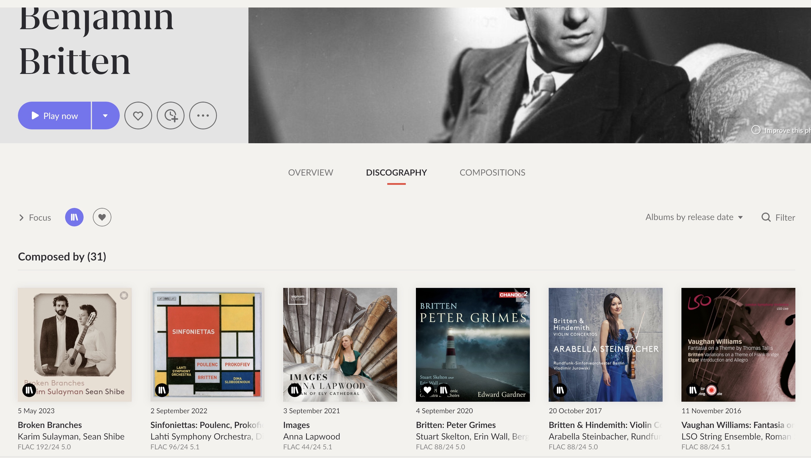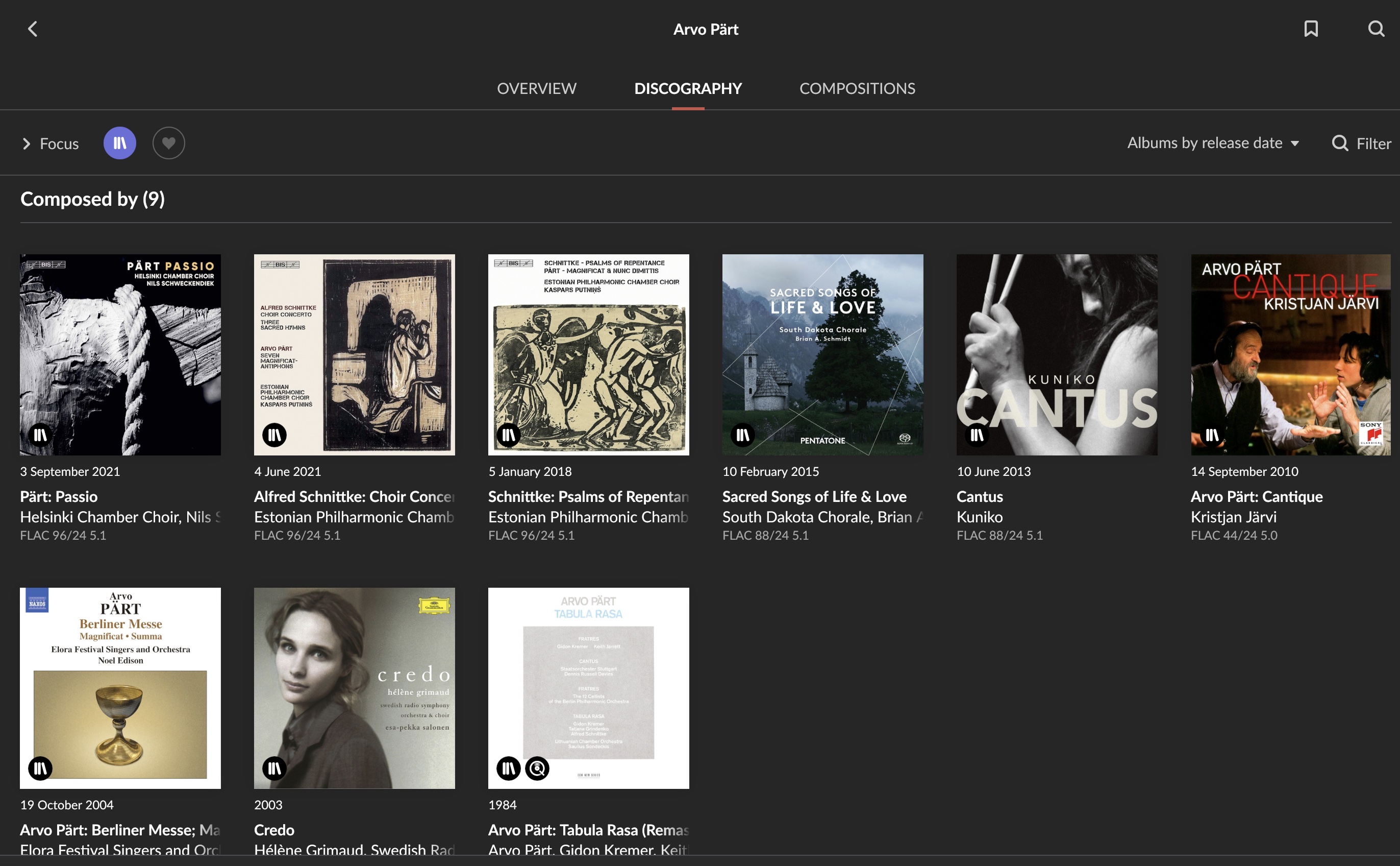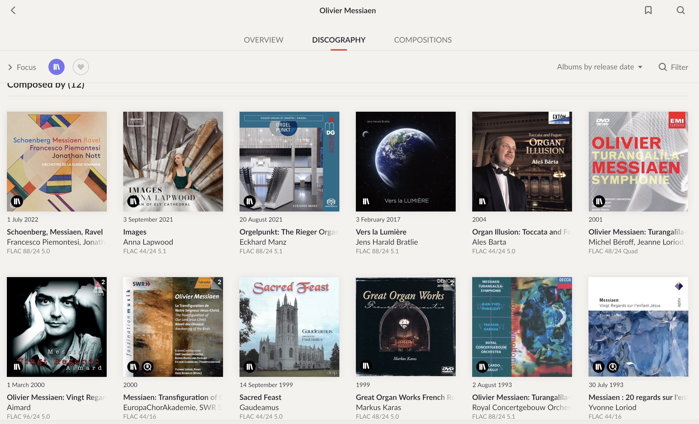 That said, there were days I was using Tidal w/ roon, bringing (compared to Qobuz) in a new dimension of metagarbage and unwanted albums/recordings, rendering the Opus listings, composition pages and recordings assigned to a composition, basically useless for me. Since then I feel way more annoyed by additional, unwanted stuff, like I have been reporting it recently with some pop/rock artists. So I like the approach of reduced discographies, basic listings and recommendations to a minimum of what has solid metadata. Even if some local albums fall over the cliff and become invisible. I can live with that, if there is a possibility to find them this or that way (via album overview or whatever). Fully respect other users coming to a completely different conclusion.