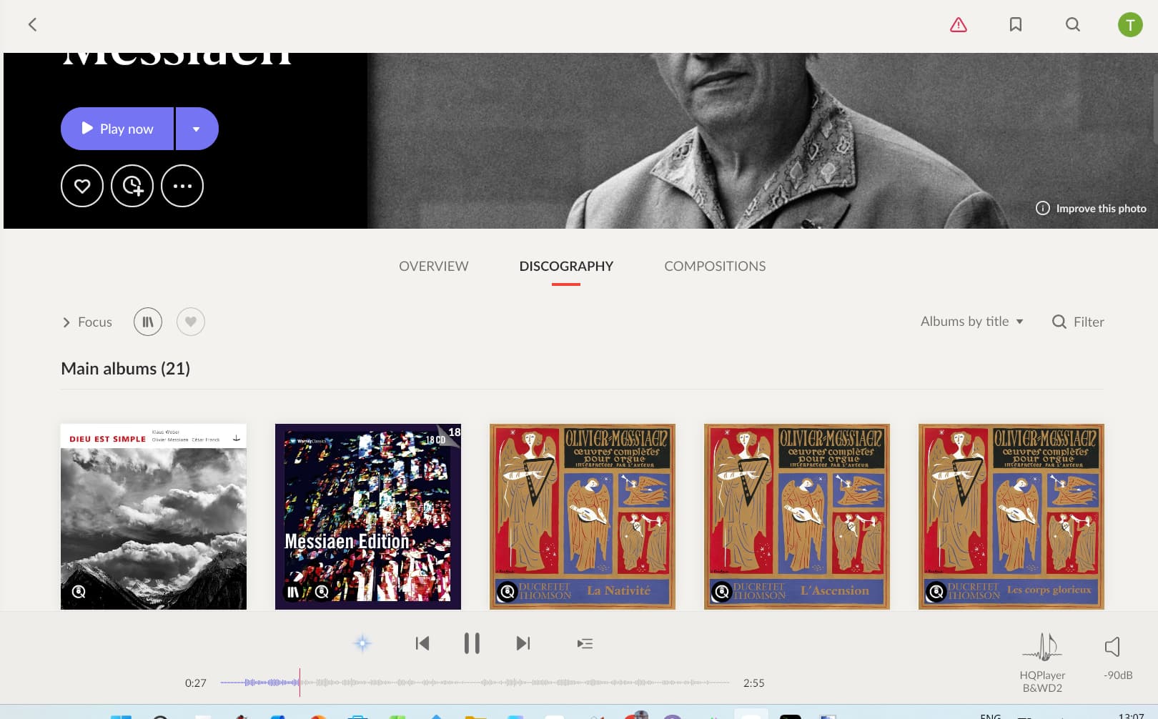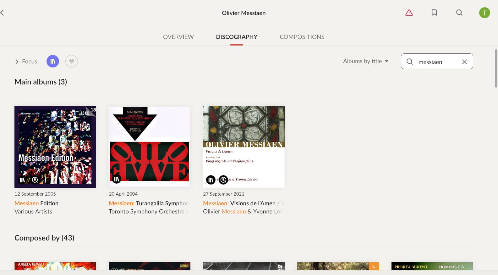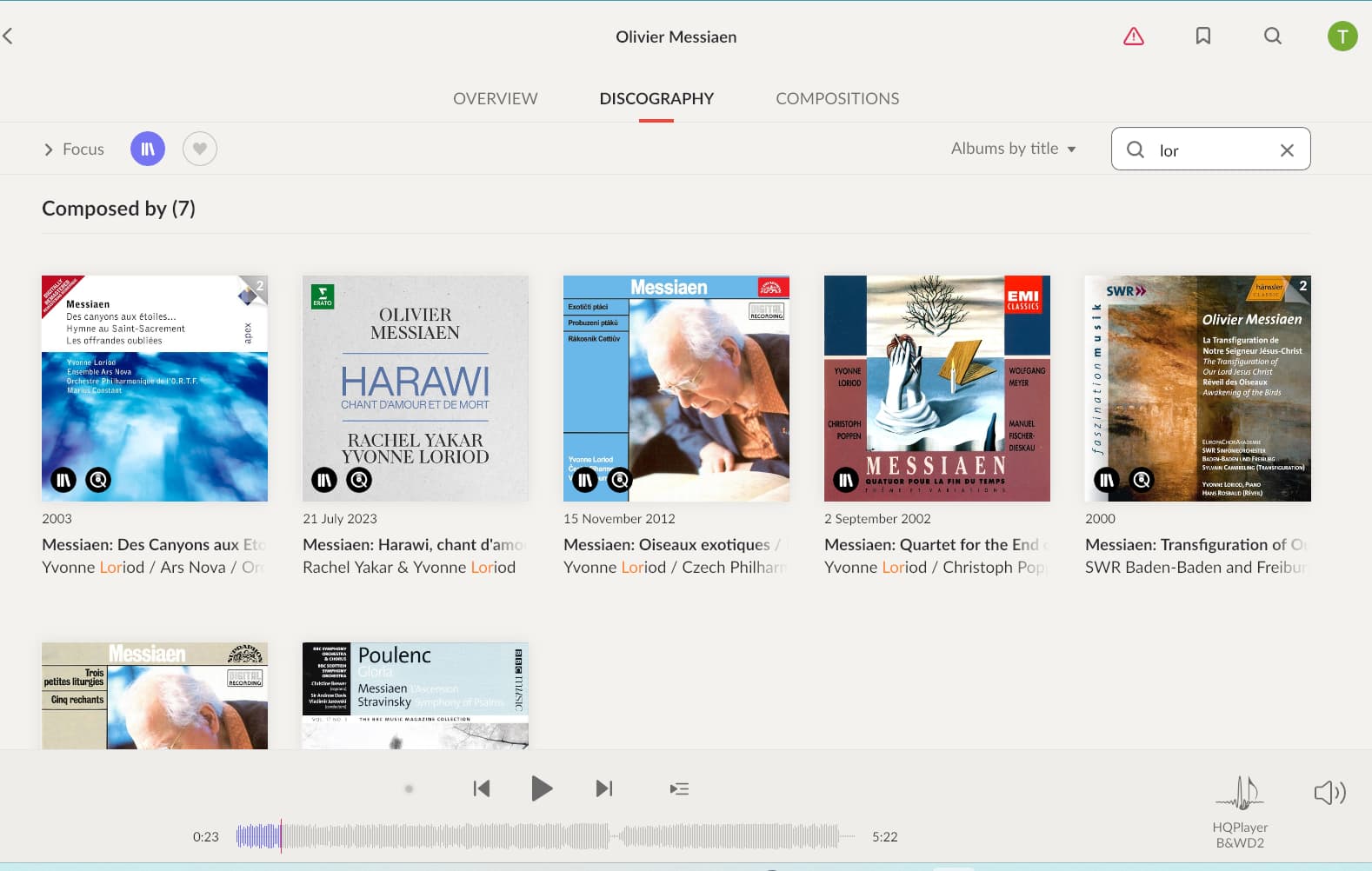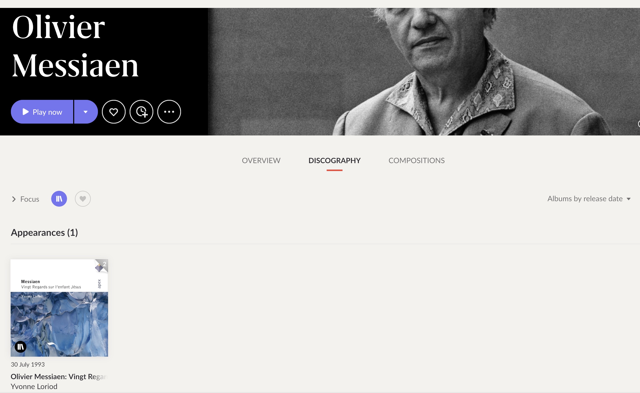 But in Messiaenâs discography only 21 albums are showing of which only 3 are library versions. This seems to be an example where only performer albums are being shown rather than composer albums of this major contemporary composer. There are no separate composer/performer sections. I donât think this is a question of spurious tags like âliner notesâ or other obvious things like setting the classical composer switch. I have done several rounds of tag clean-ups, although you never know as roon seems to be near constantly updating tags in background.