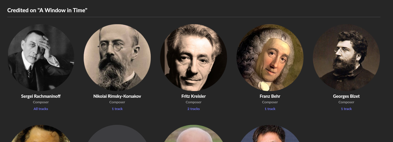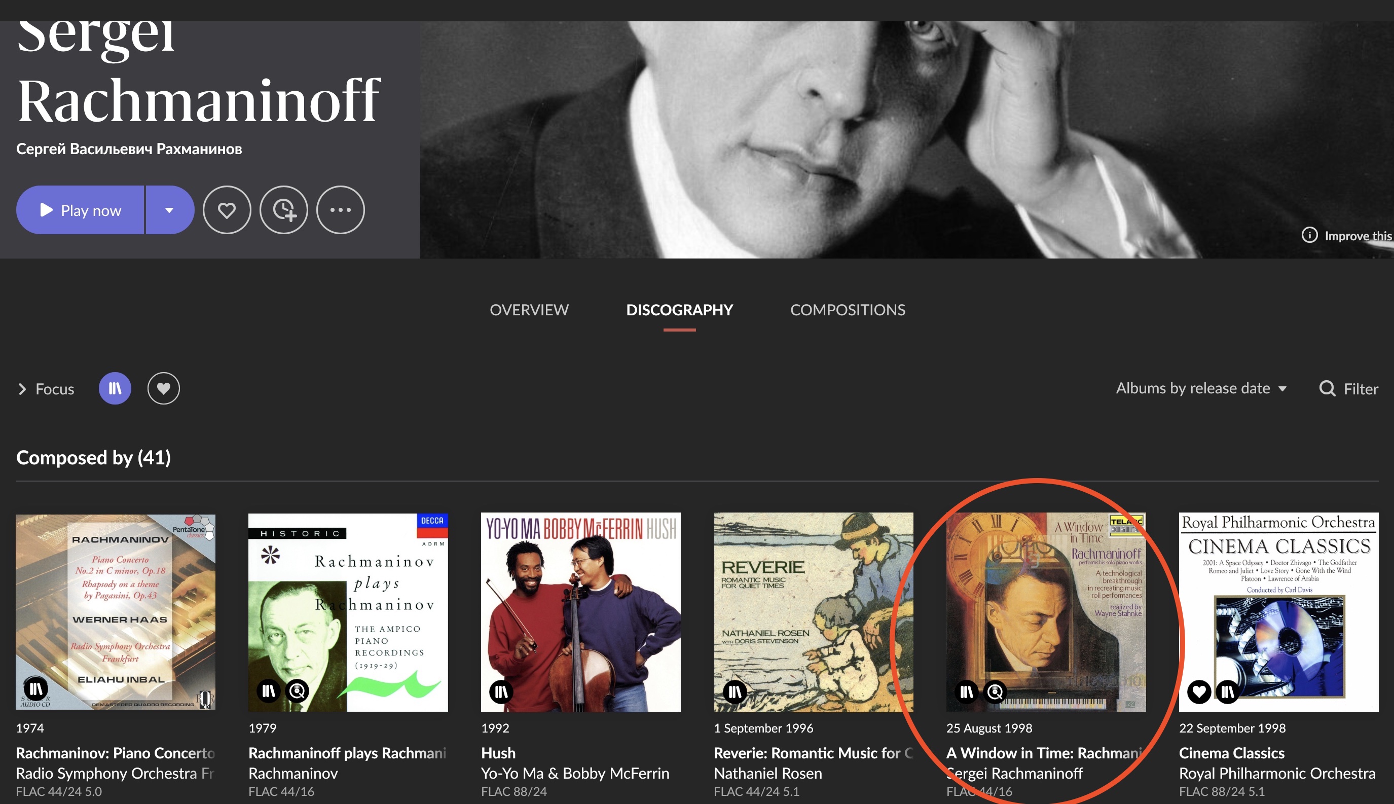 This doesnât seem to be the case for âA Window in Timeâ. As I mentioned, on this album if Rachmaninoff has any other credit in addition to Composer, the album will not show. ![]()