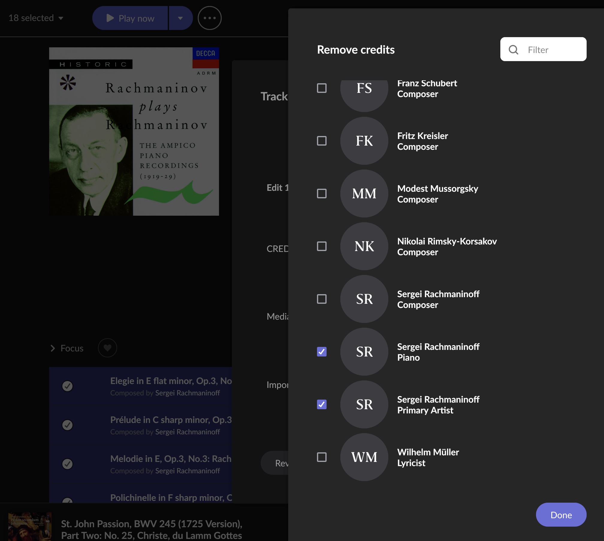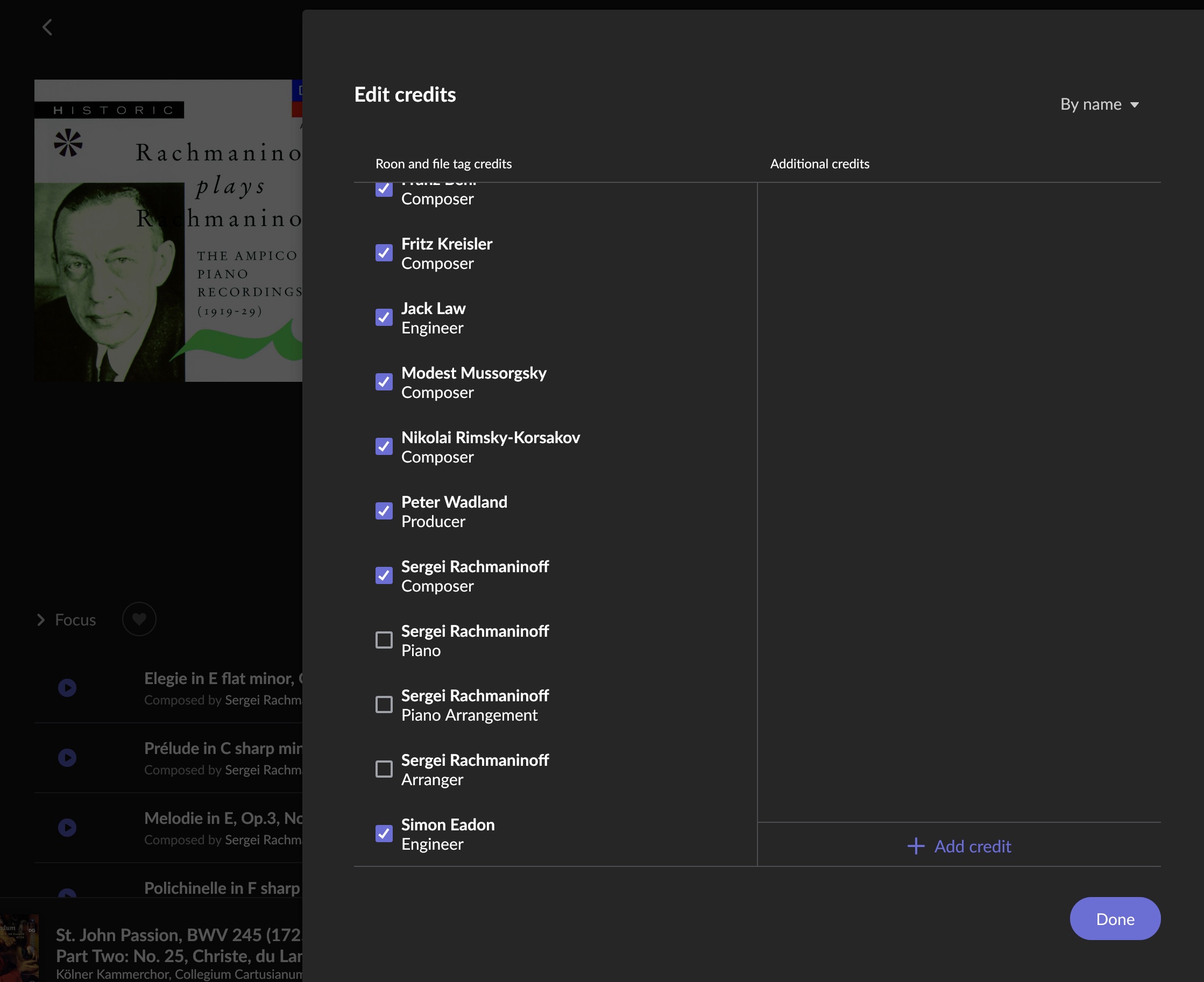 However, no matter what I do with the Rachmaninoff album, it will not display properly under Rachmaninoff as the composer. Perhaps if there was a way to prevent Roon from adding additional credits that do not appear the the fileâs metadate, it might work. But I donât see how to make Roon do this for just this album. Still, the idea of removing correct metadata (ie removing Rachmaninoff as the artist when it is him performing) just to try to appease Roon really bugs me. Iâm at the point of giving up on this one. Itâs not worth all this hassle. ![]()
