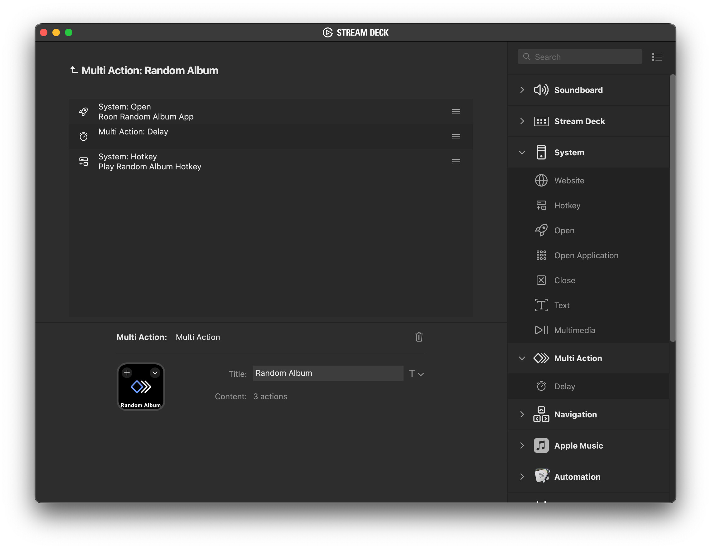 I set up a multi-action that opens the app (or brings it to the front if it’s already running), pauses for one second to make sure it’s open, and then presses the hotkey R, which is the keyboard shortcut in the Roon Random Album app to play a random album. Works great!