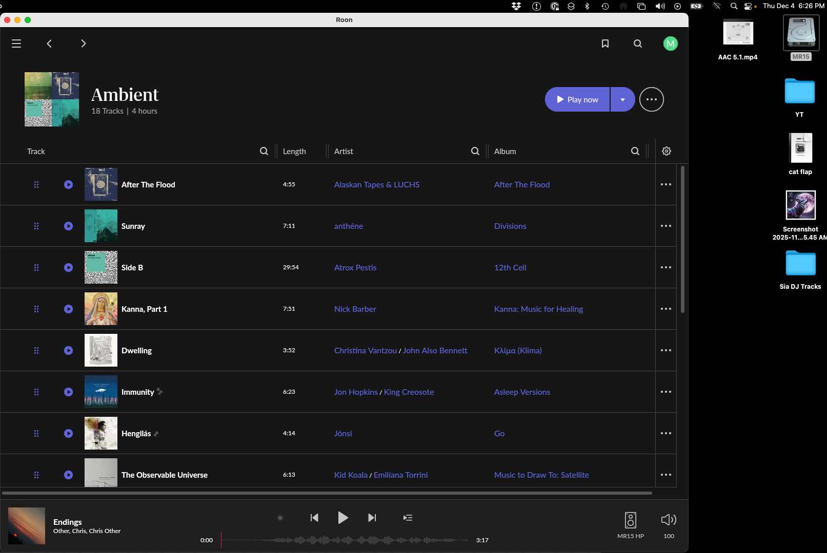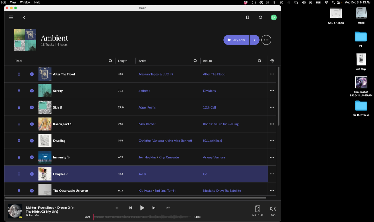 Hi. Still having random stops with roon playback of local music files. Not sure if this ALSO happens with streaming because i dont use streaming. In order to mix it up, recently moved Roon server onto a new mac mini, and converted all library to FLAC. So its all the same format now (although some different sample rates etc). After a few hours of a playlist playback, roon just stopped. Please see screenshot for approx time. I thought that the issue (previously) may have been running roon server and the end point on the same laptop, but now I have seperated the two and I still have the same issue. The commonaility is that the end point in both cases which stops is a 2015 intel macbook pro. However, this is the end point that kinda needs to work! Please help! :) Can you see what happens on your side around the time of the stop?