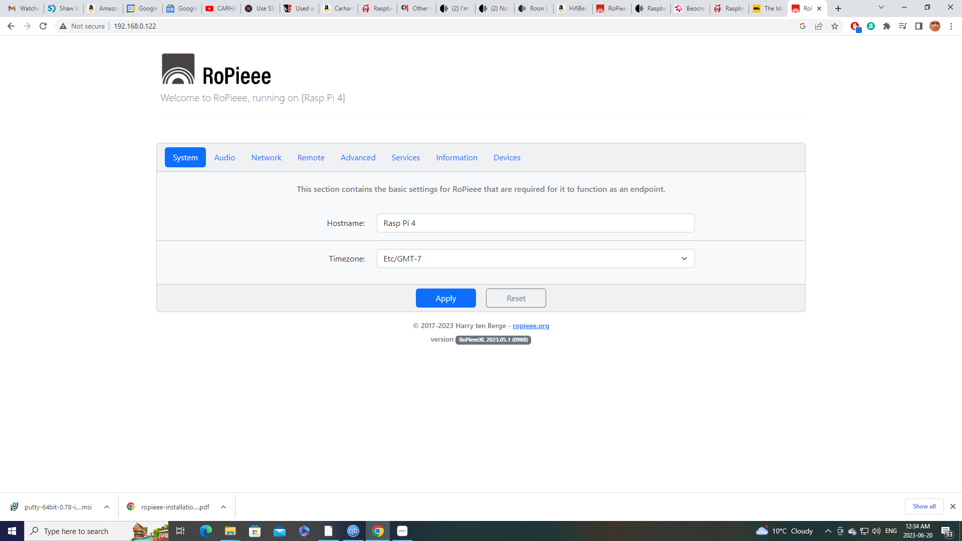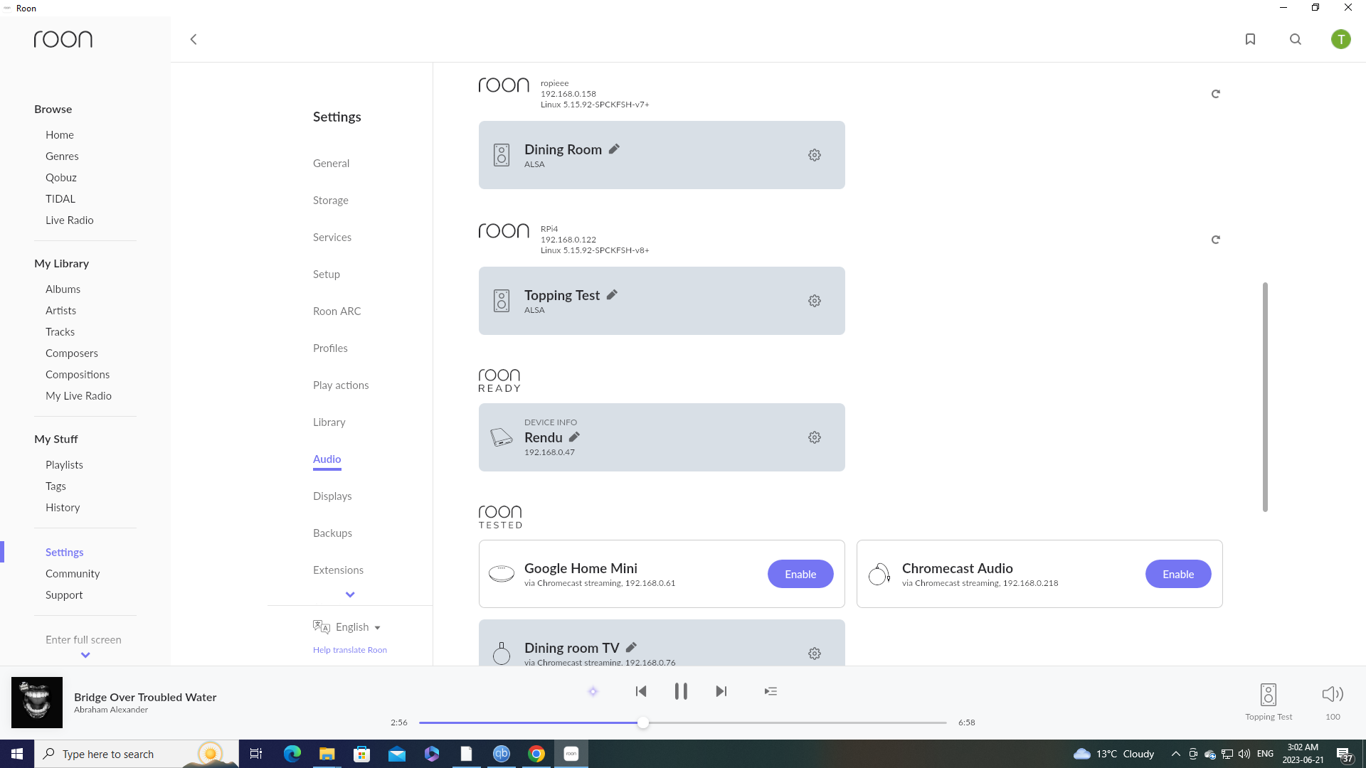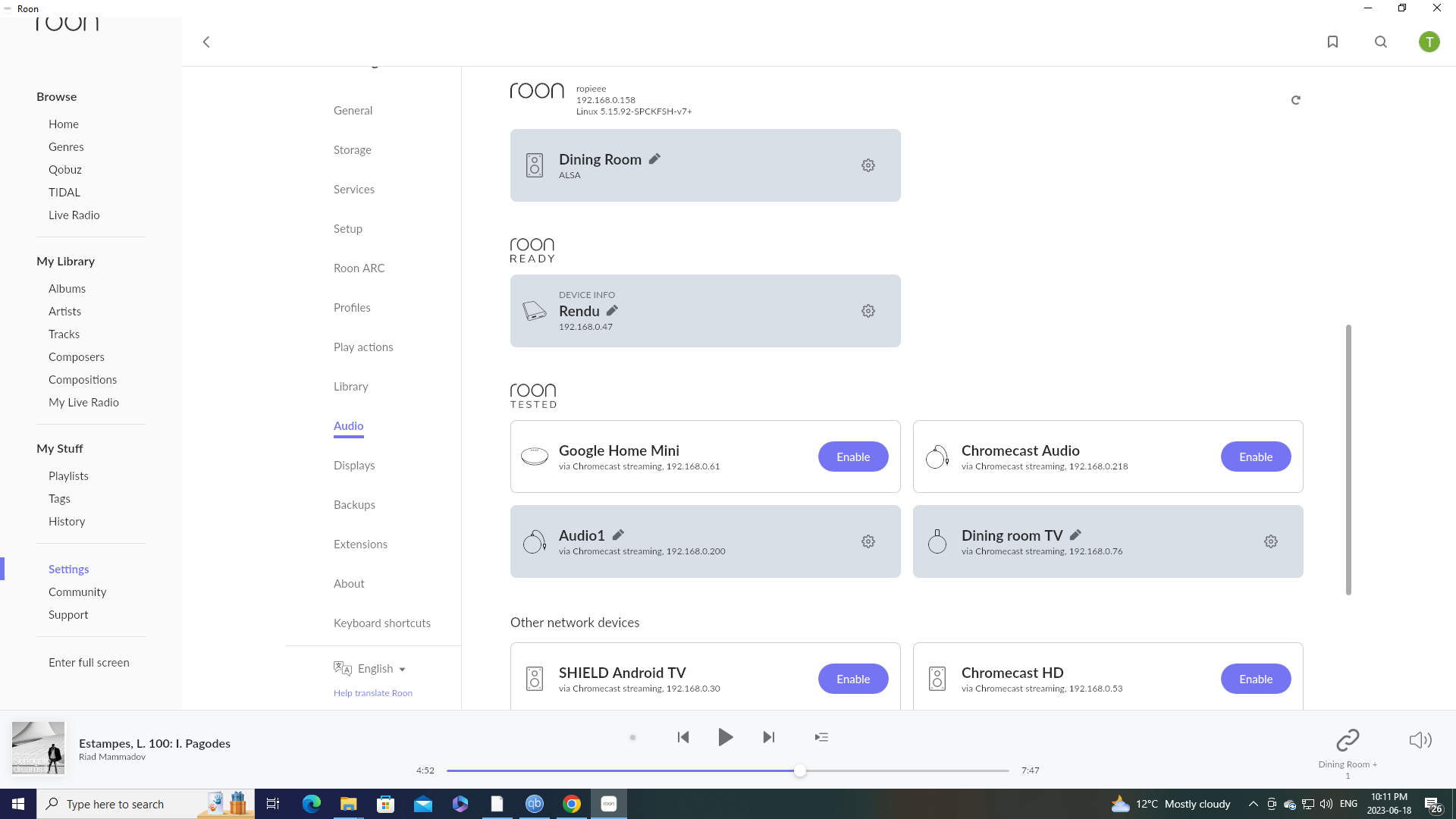 My Raspberry Pi at 192.168.0.122 shows in Roon About Settings but not under the Auidio Settings.