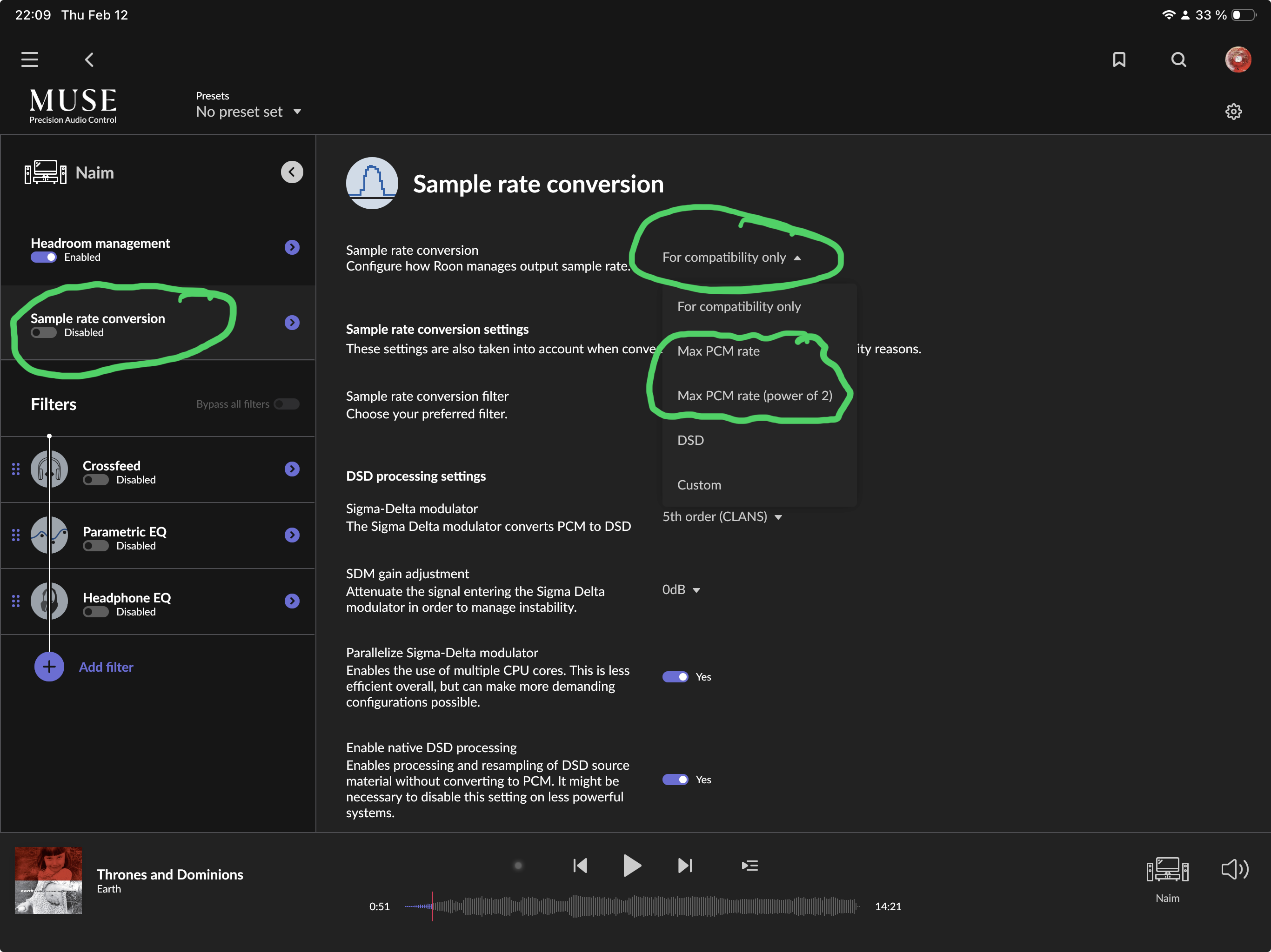 Of course, if you think that Roon makes a better conversion, you can go to MUSE and convert everything to the maximum of 384 kHz that the NDX2 accepts as input. I tried this in the past but if there is any audible difference at all, I preferred letting the NDX2 do its thing. YMMV.