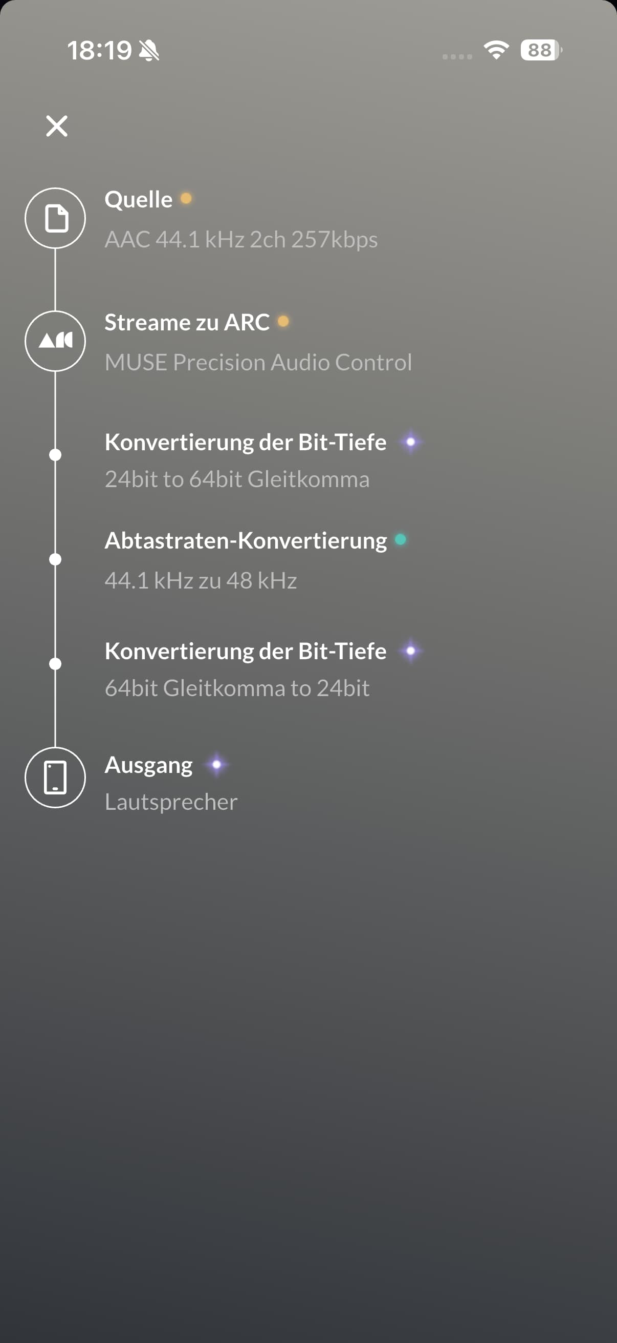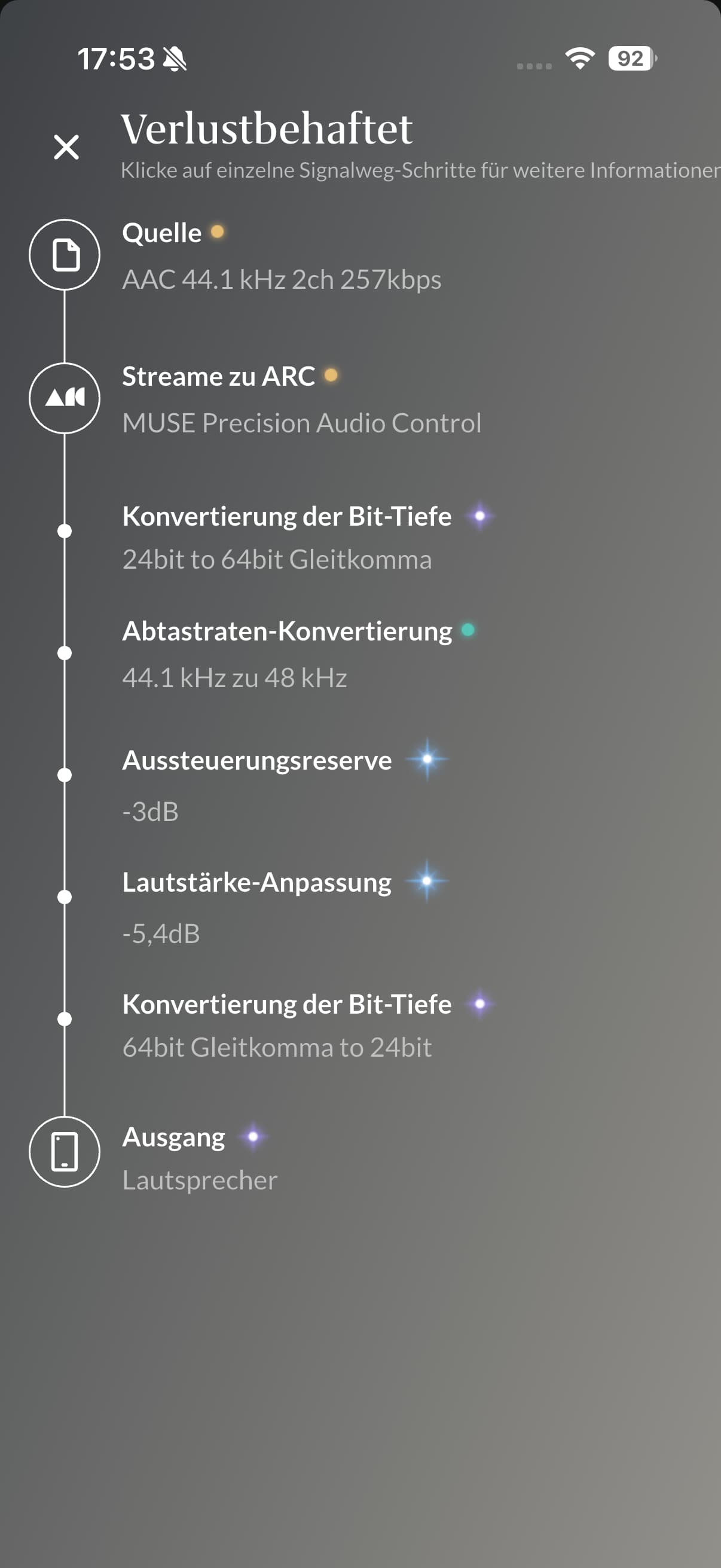 I now tried to disable everything I’ve found (volume leveling, headroom management, etc.), but I can’t get ARC not to convert between 24 bit to 64 bit and back. It seems an iPhone only supports 48 kHz, so I can’t get rid of the 44,1 to 48 conversion.