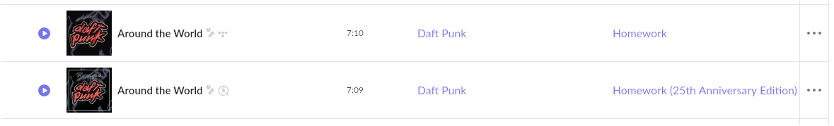 Looking through the tracks I can see why some aren’t being detected as duplicates. It seems the matching on FreeYourMusic matched the same source song on Amazon to slightly different variants on Qobuz and Tidal. For example, Daft’s Punk’s “Around the World” track got mapped to Homework on Tidal at a length of 7:10 and Homework (25th Anniversary Additon) on Qobuz at 7:09. Got it. Makes sense.
