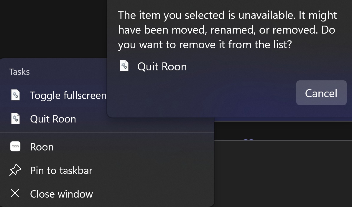 When I right-click on the Roon app running on my Windows 11 laptop, the top two options are no longer functional and return an error when selected: