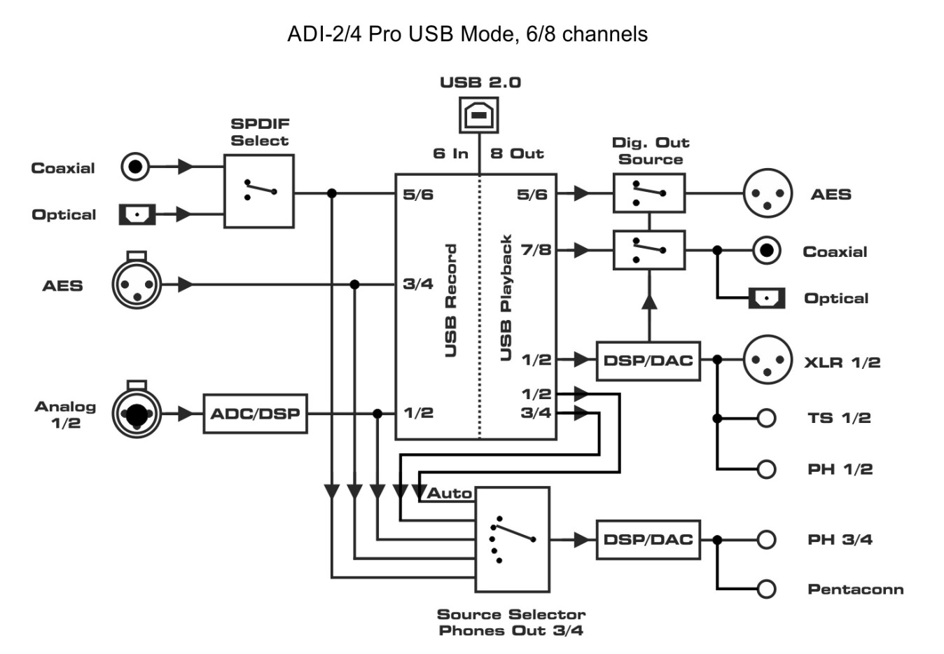 You also have to run the ADi in Multichannel USB-Mode. This is the schematic of the unit in this mode (see manual)