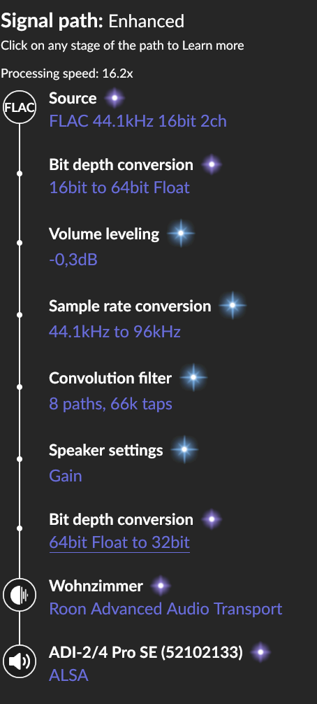 In Roon you have to setup a convolution filter with two (stereo) inputs and eight outputs. This filter includes the XO. Also you have to disable downmixing and enable 7.1 in Roon. Doing this the signal path looks like this: