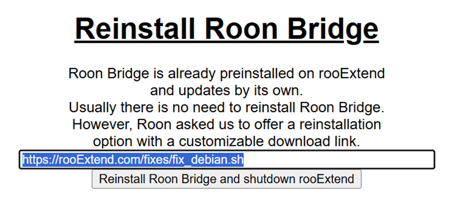 So, I followed the fix instructions and it seemed to work as expected with one exception, The change to the URL in the “Reinstall Roon Bridge” section did not stick…i.e. after the reboot and power off/on, the reinstall URL in the rooExtend UI went back to the original URL (not the new one). Is that the correct behavior?