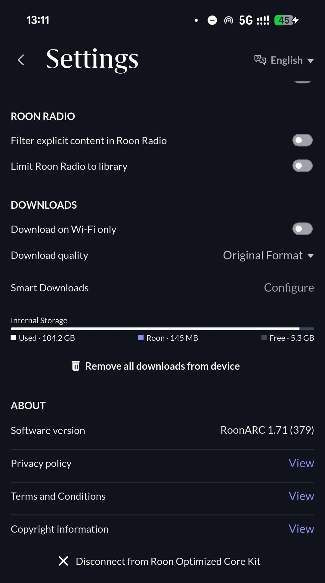 · In the Roon ARC app on android I am unable to download songs as it says I have no storage left (I have 8GB free on my phone and I am trying to download 500MB of data). It is quite annoying, also I can't seem to download specific songs, only entire album are allowed, which I also find quite strange.