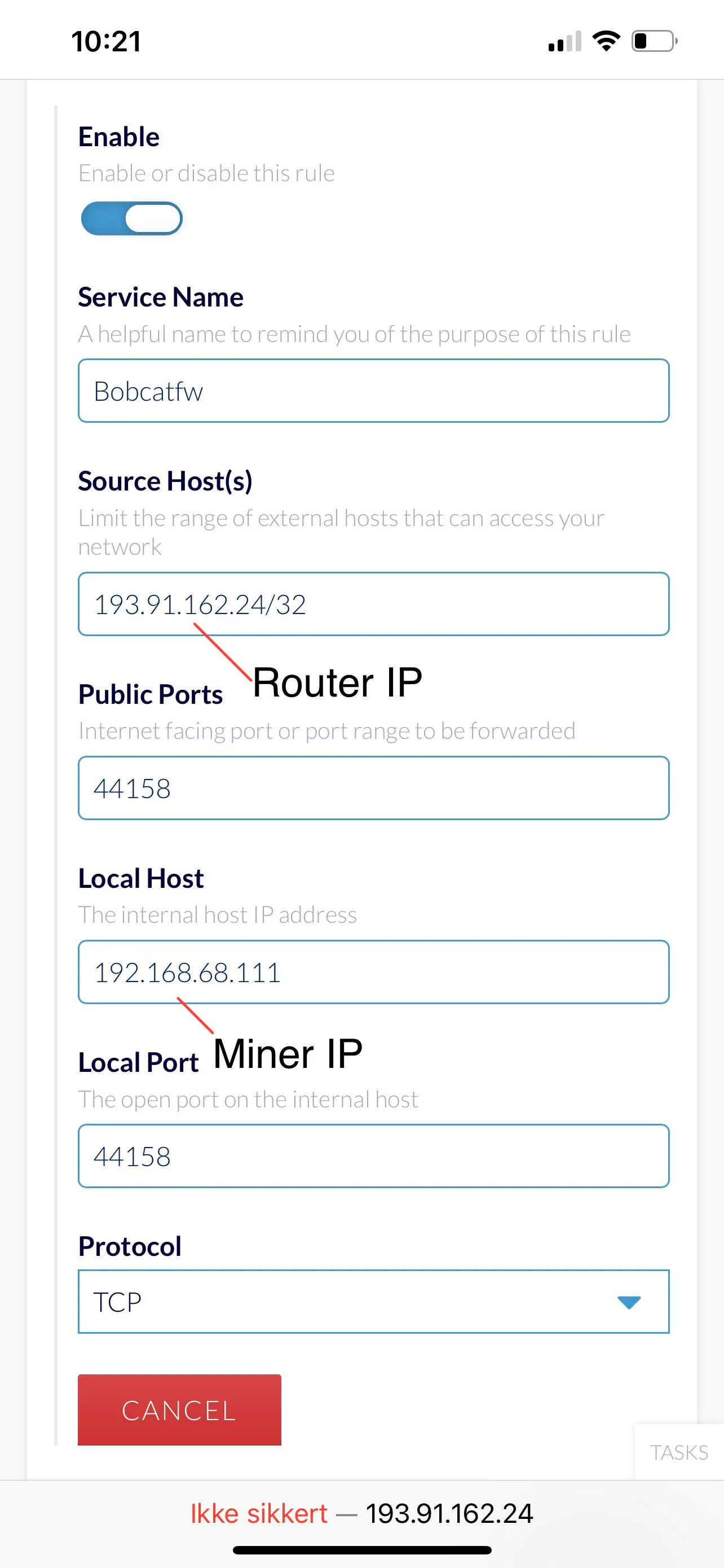 I have enabled UPnP, set the port to the same as in Roon. Don’t know though what to put in at Source Host and Public Ports though. Protocol I have set as TCP.
