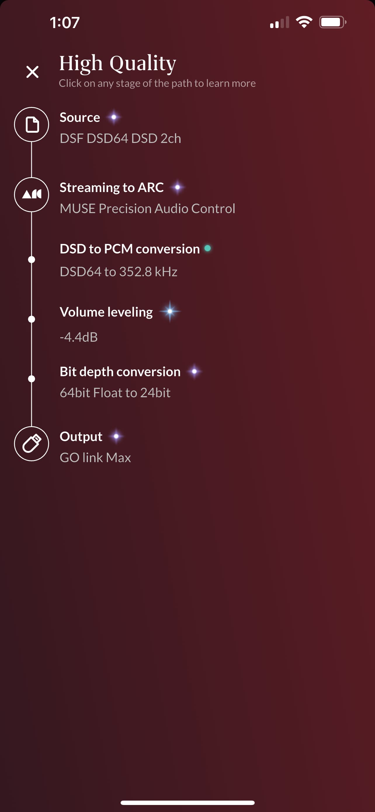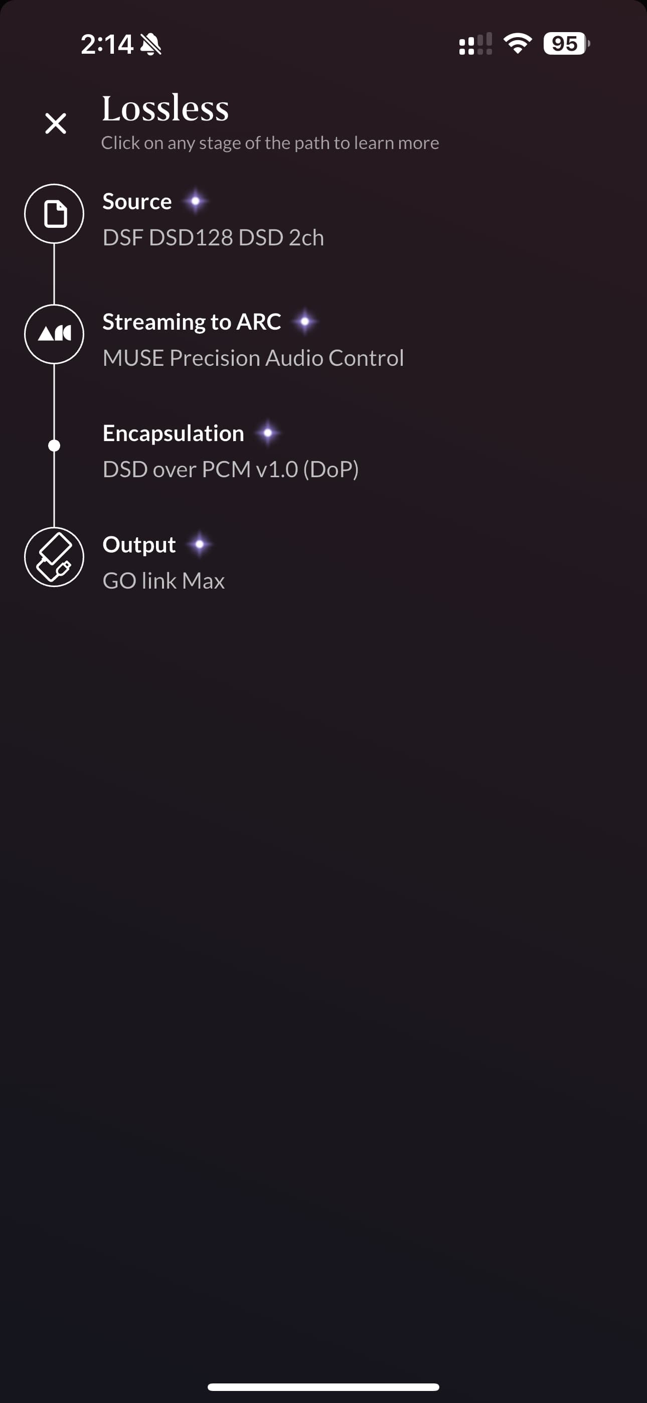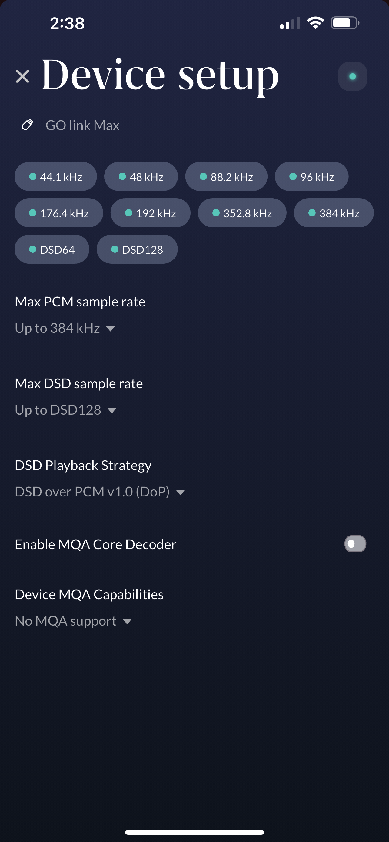 Update. I had the auto rate switch enabled. I’ve turned that off and gone to Original Format for wifi and cellular. But although Muse says the go link max will do DSD128 and I have DSD Playback Strategy set at DSD over PCM, DSD64 is downconverting to PCM 352.8. So, still not quite there. Your input will be helpful! JCR
