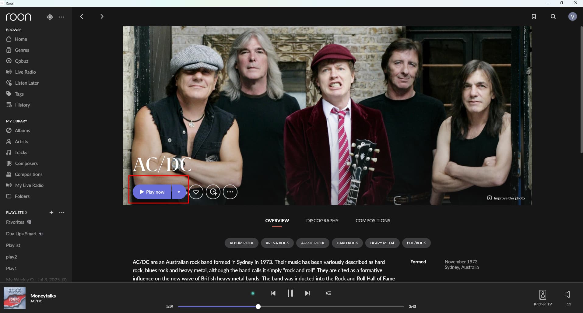 In Roon ARC, this same shuffle-based play action is not currently supported. ARC starts playback using a simpler play context, which is why you only see a single track play instead of a shuffled selection from the artist’s discography.