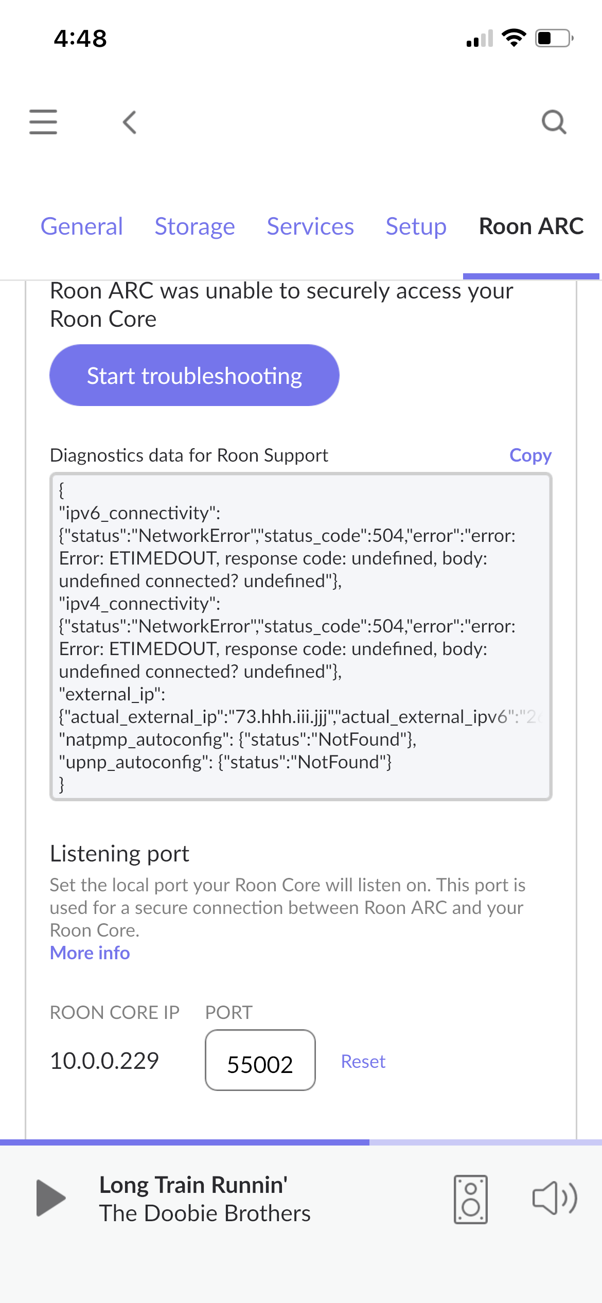 My Roon Arc stopped working. Was working fine and all of a sudden it can’t connect to my network anymore when not connected to my WiFi. I have a Nucleus. See attached error messages and details of system. I’m pretty much a novice on this and any help would be appreciated. Thank you.