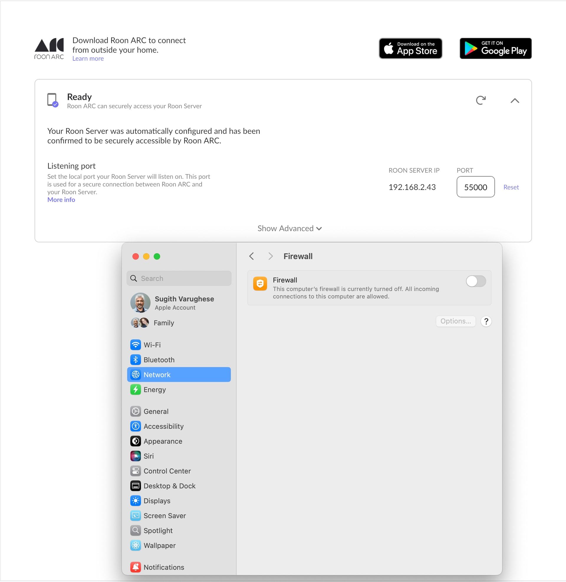 Ensure the Roon Arc rule for port 55000 is still pointing to Sugiths-iMac.