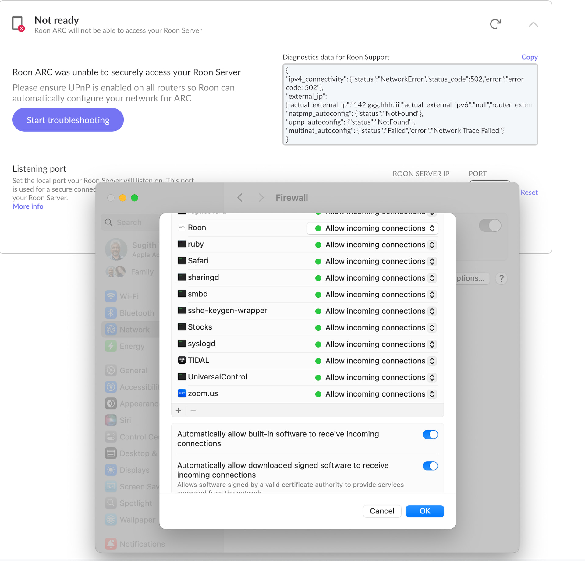 If the status remains “Not Ready” after these steps, the issue lies deep within the macOS network filter stack. Since Roon is confirmed to work perfectly when the firewall is disabled, we recommend contacting Apple Support or visiting an Apple Genius Bar. They can help diagnose why your specific macOS installation is failing to honor application exceptions.