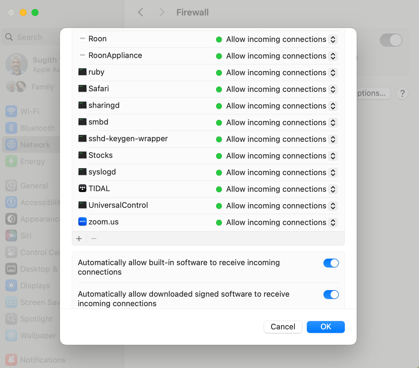 If the prompt does not appear, manually add Roon and Roon Server back into the Firewall Options using the plus (+) button.