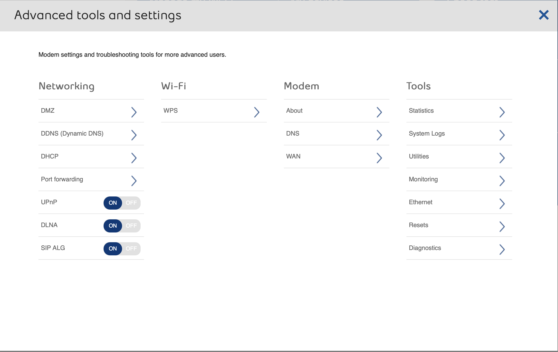 Navigate to Advanced Tools and Settings > Port Forwarding (the exact naming might vary slightly depending on your specific modem model).