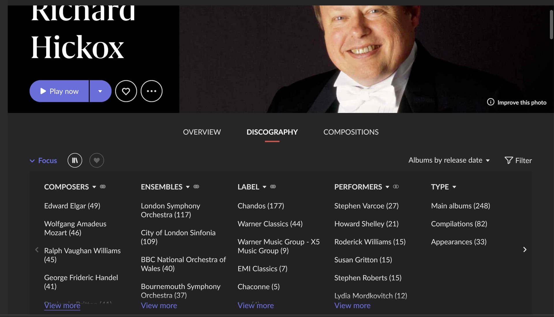 I have seen this happen with a small number of artists when clicking on view more composers under focus. It happens with “Richard Hickox” as well.
