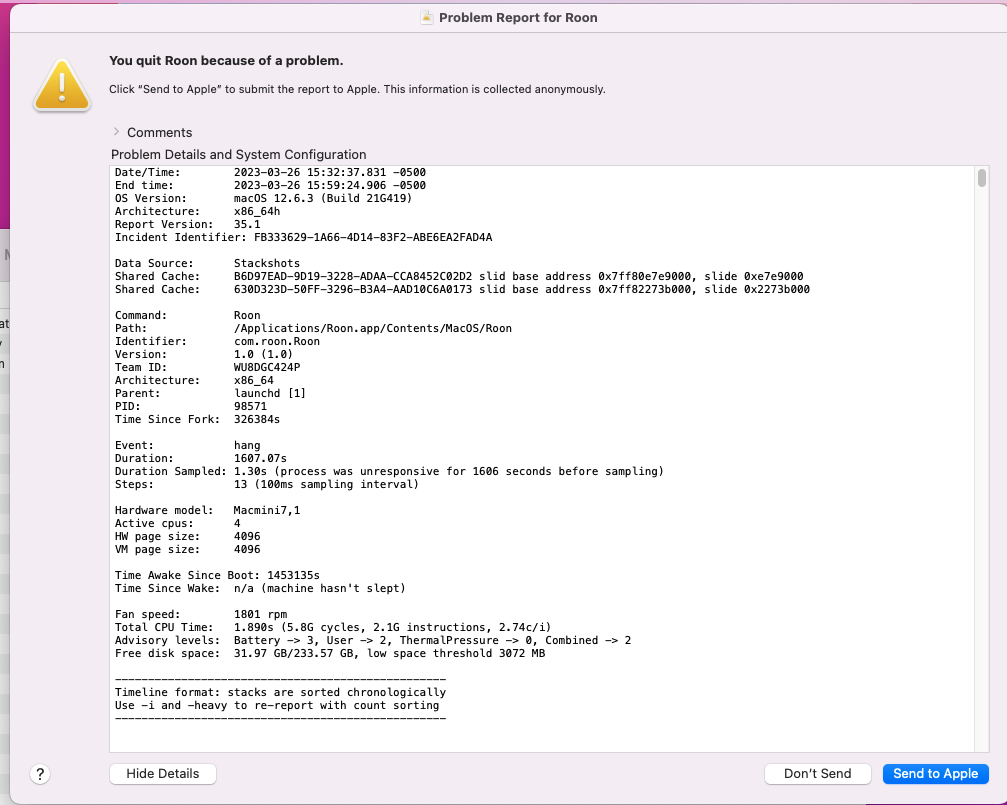 Ben here with the support team, I wanted to check in on this thread to see if you were still running into issues? Do you receive an Apple crash report when Roon crashes?