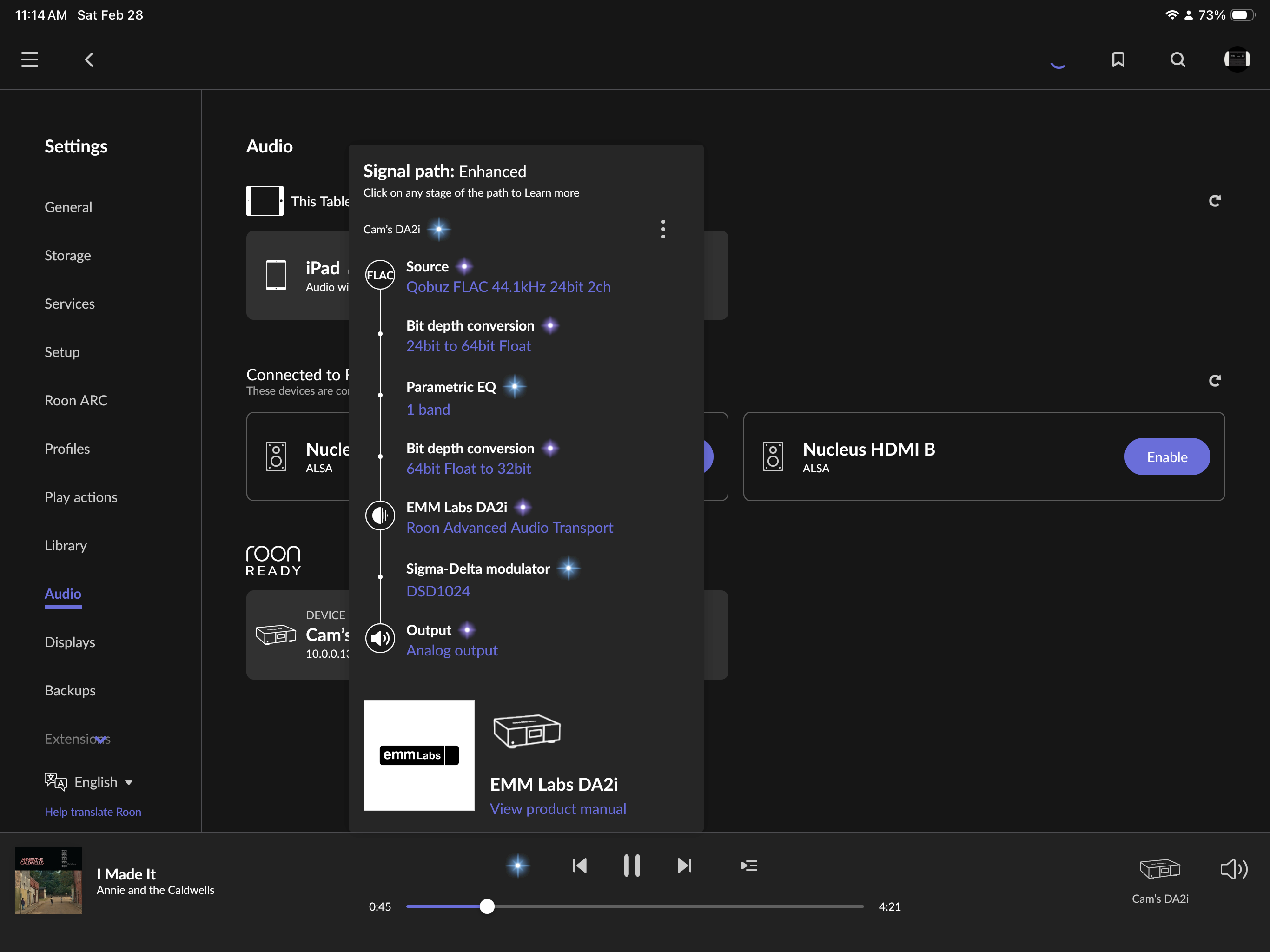 Roon has been very slow to load up new pages and play tracks. The issue is the same regardless if the track is -layer from my Melco N1Z/2EX NAS or Qubuz. Rebooting my Nucleus+ has not helped, nor has reloading the Roon software. My system is Roon Core on Nucleus+, Roon Remote on iPad Air, wifi via 6e router, Roon Player on EMM Labs DA2i.