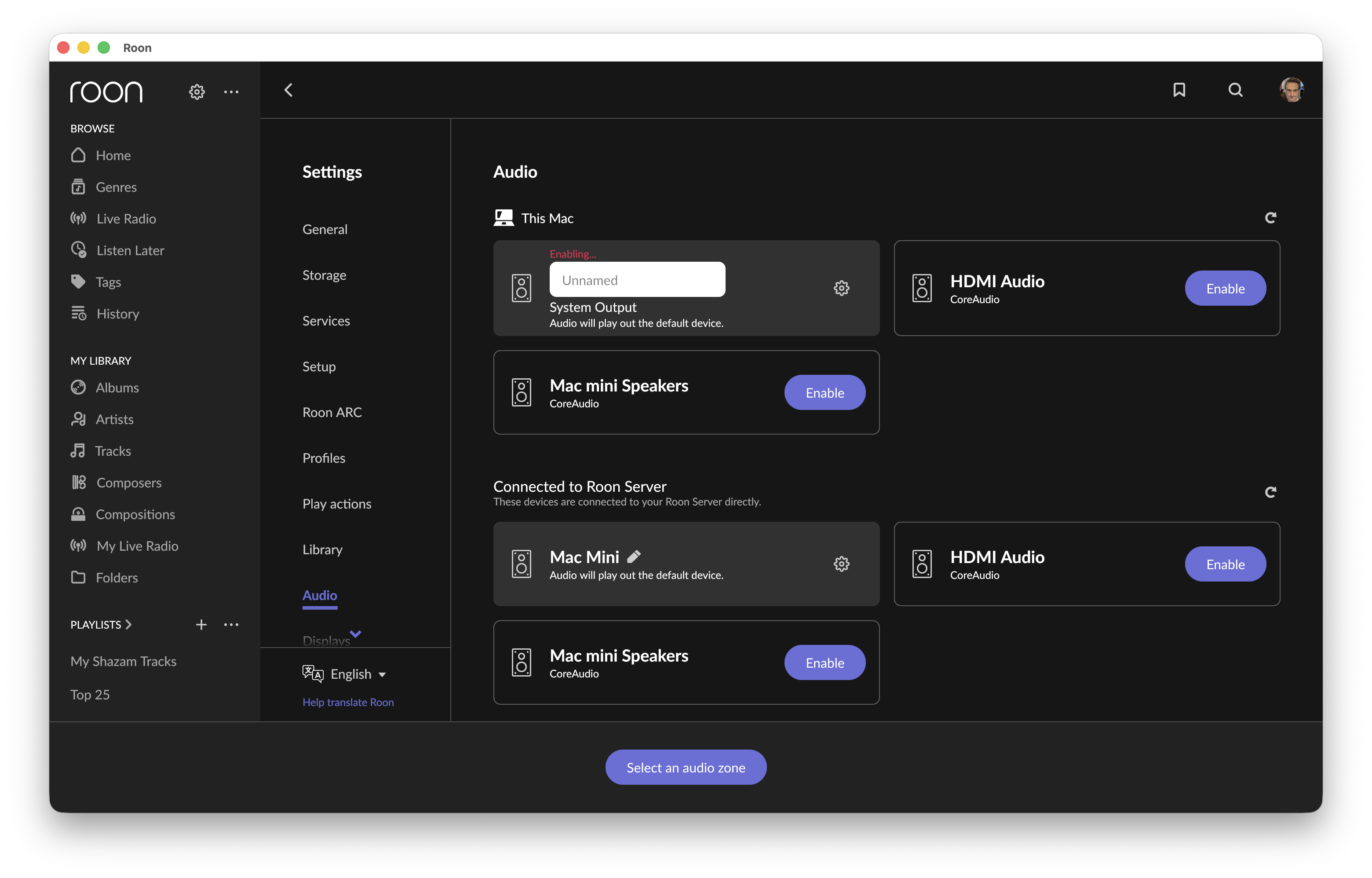 · Often, when launching Roon on my MacBook, the app does not initiate the MacBook's audio, and I cannot select it as an audio zone. If I go into the Audio Settings, the System Output shows "unnamed" and above the input field "Enabling…" and nothing happens.