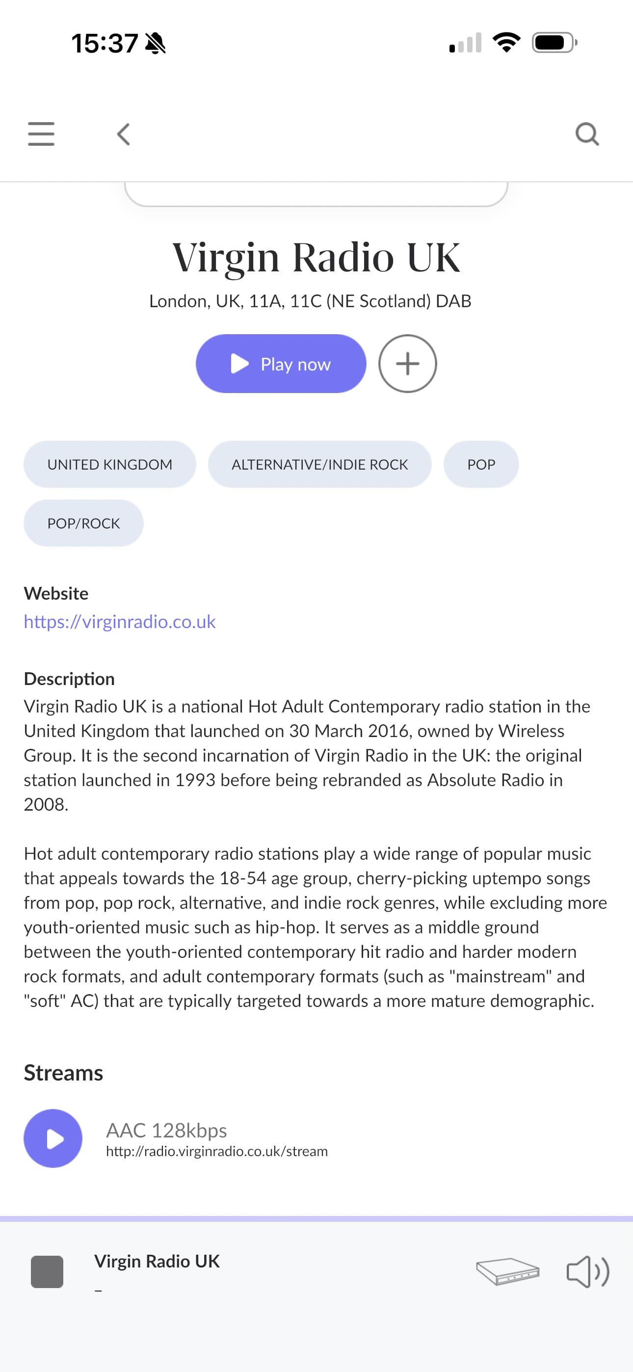Hi there. I have tried magic radio UK and that works fine. Also tried Virgin radio RCK Switzerland and also seems to work as does classic FM UK. However, Virgin radio UK reverts to play talk sports radio station. Very strange! Any advice welcome