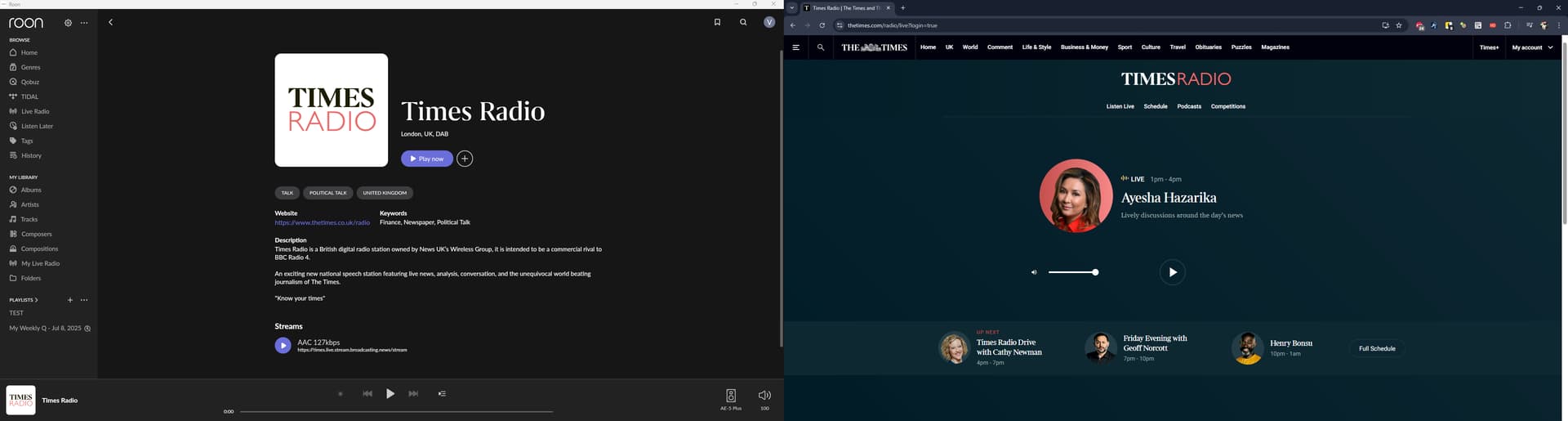 I’ve just checked the Times Radio broadcast directly in Roon, and I can confirm that it matches what is currently playing on the official Times Radio page.