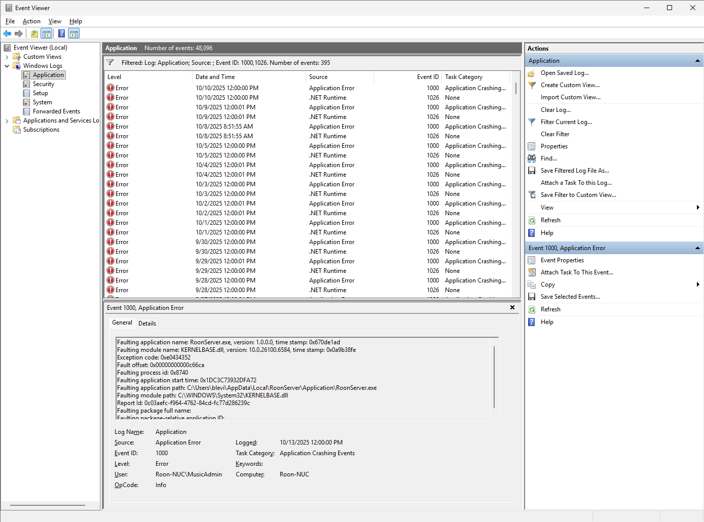 On the issue of roonserver.exe crashing on me, I have more data. As you can see from this event log snapshot, my roonserver.exe has been crashing once or twice a day, regardless of memory consumption.