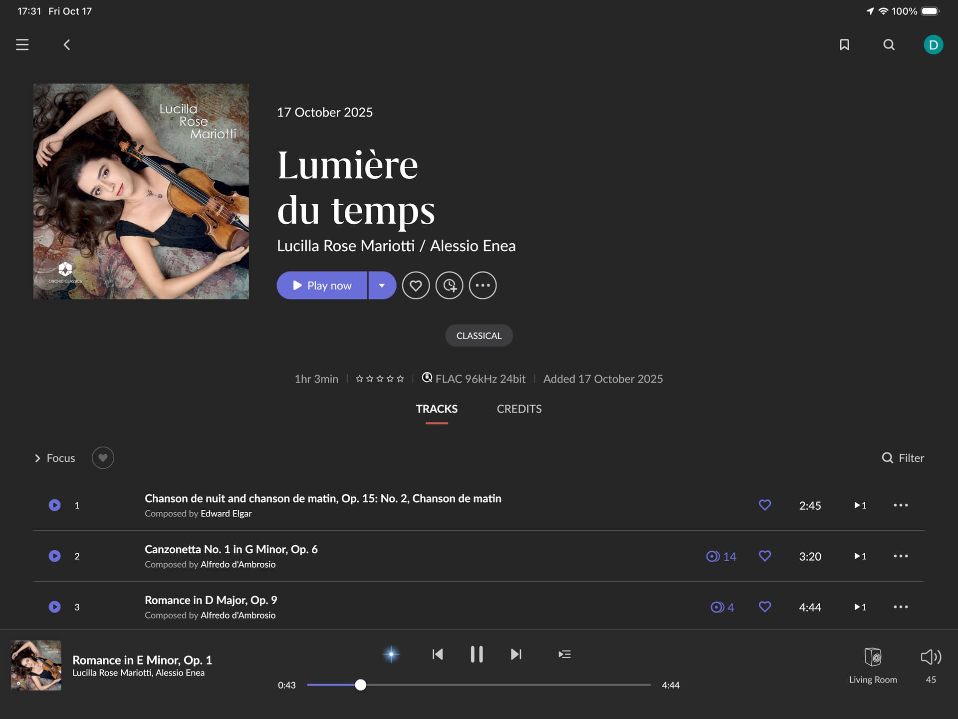 So many excellent new releases out today and old remasters! If you enjoy violin music, listen to this exceptionally recorded recital by the Italian violinist, Lucilla Rose Mariotti. The piano accompaniment is well-balanced and an equal partner.