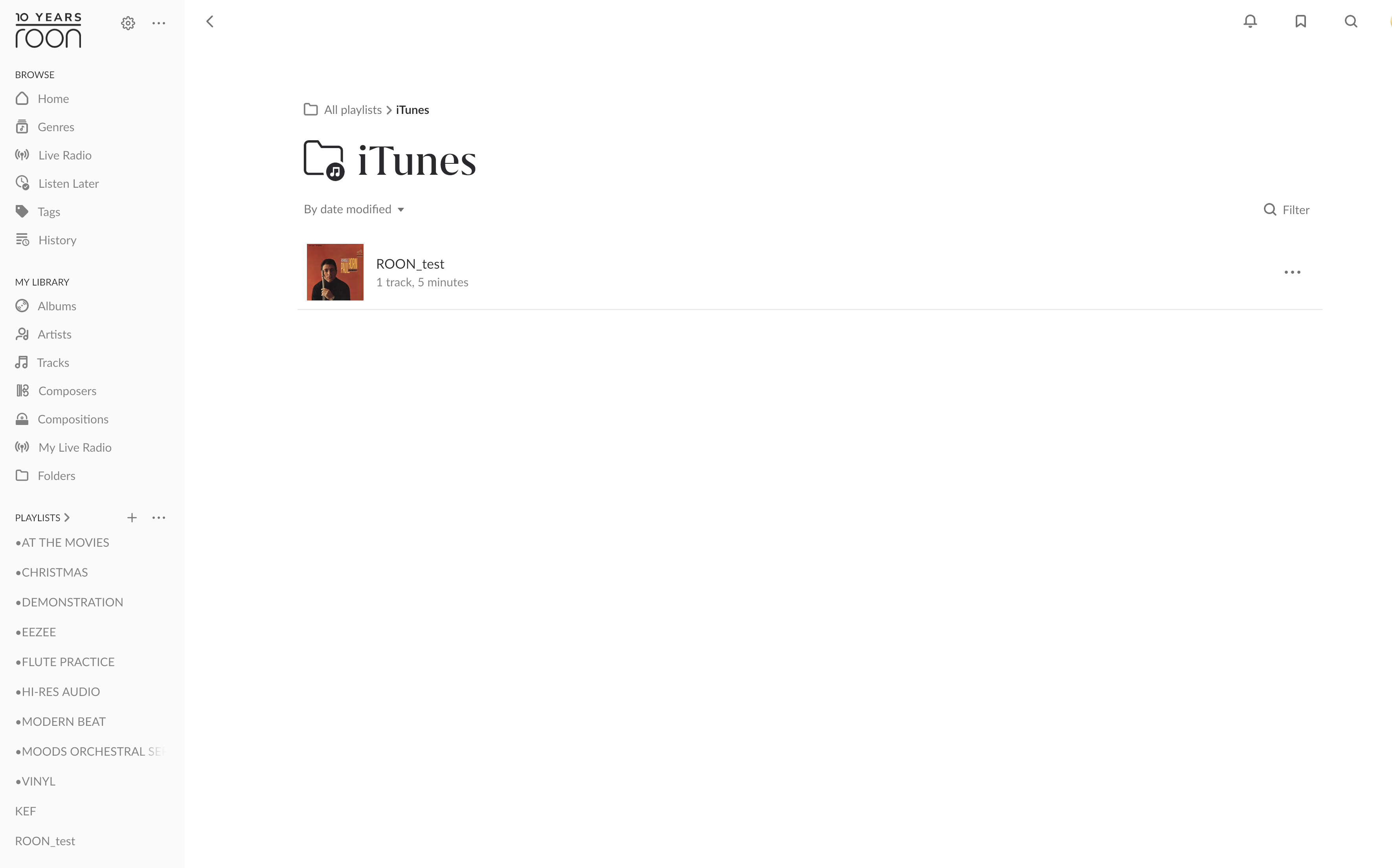 *****Having tried many tests I am left with a playlist folder called ROON_test that is linked to iTunes but which cannot be deleted. This is a very annoying situation and not very user friendly that it cannot be deleted even though the iTunes playlist called ROON_test has been deleted.