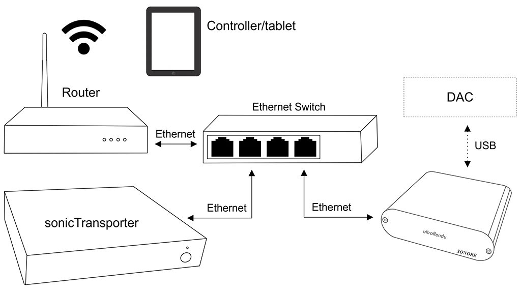 Netgear Nighthawk CAX30 > DLink 5 port gigabit ethernet switch> ethernet to Sonictransporter and ultrarendu