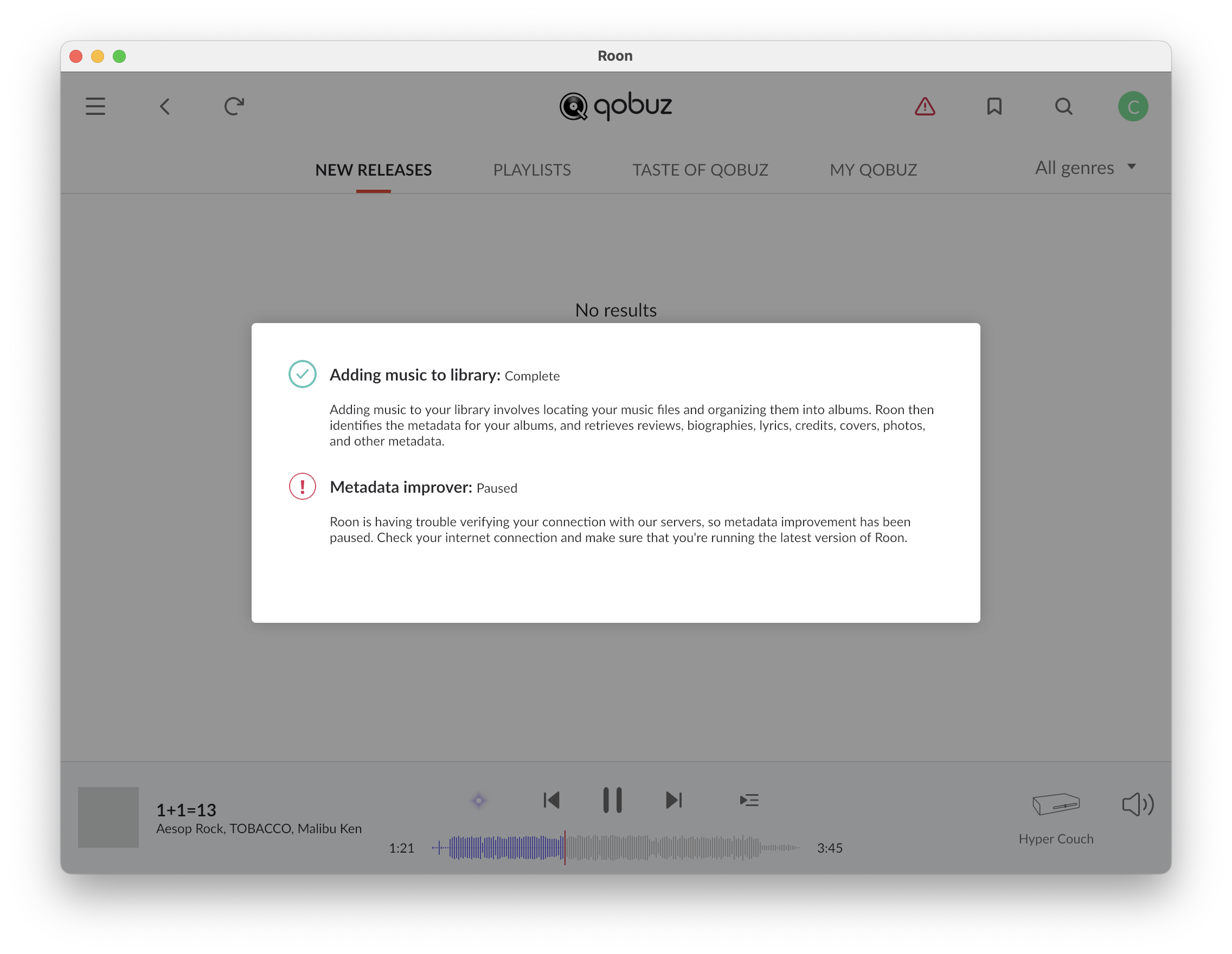 Roon is not connecting to Qobuz. Qobuz New Releases shows no albums and states "No results". I also have a warning about Metadata Improver stating that Roon is having difficulty connecting to the servers. I have restarted the device that Roon is running on. I have verified that Roon can stream local music to my other devices.