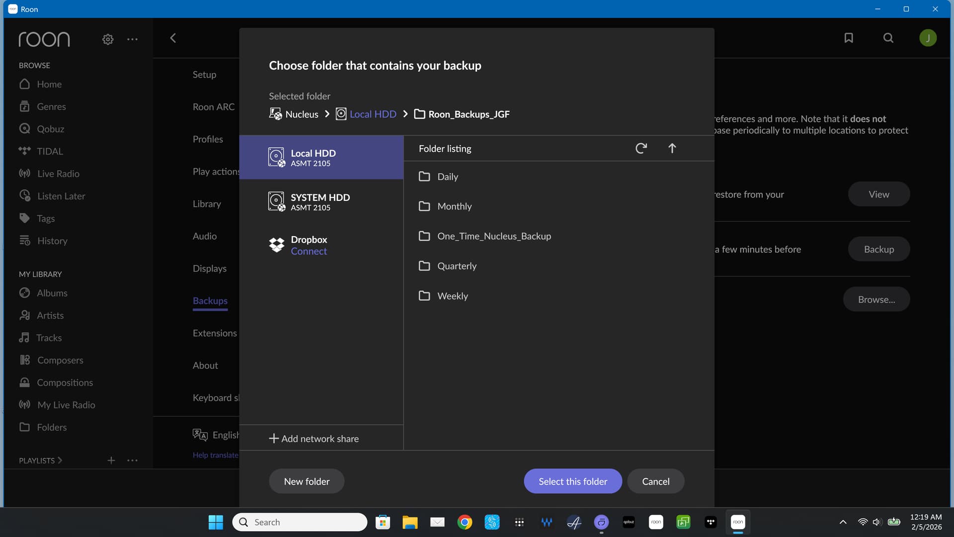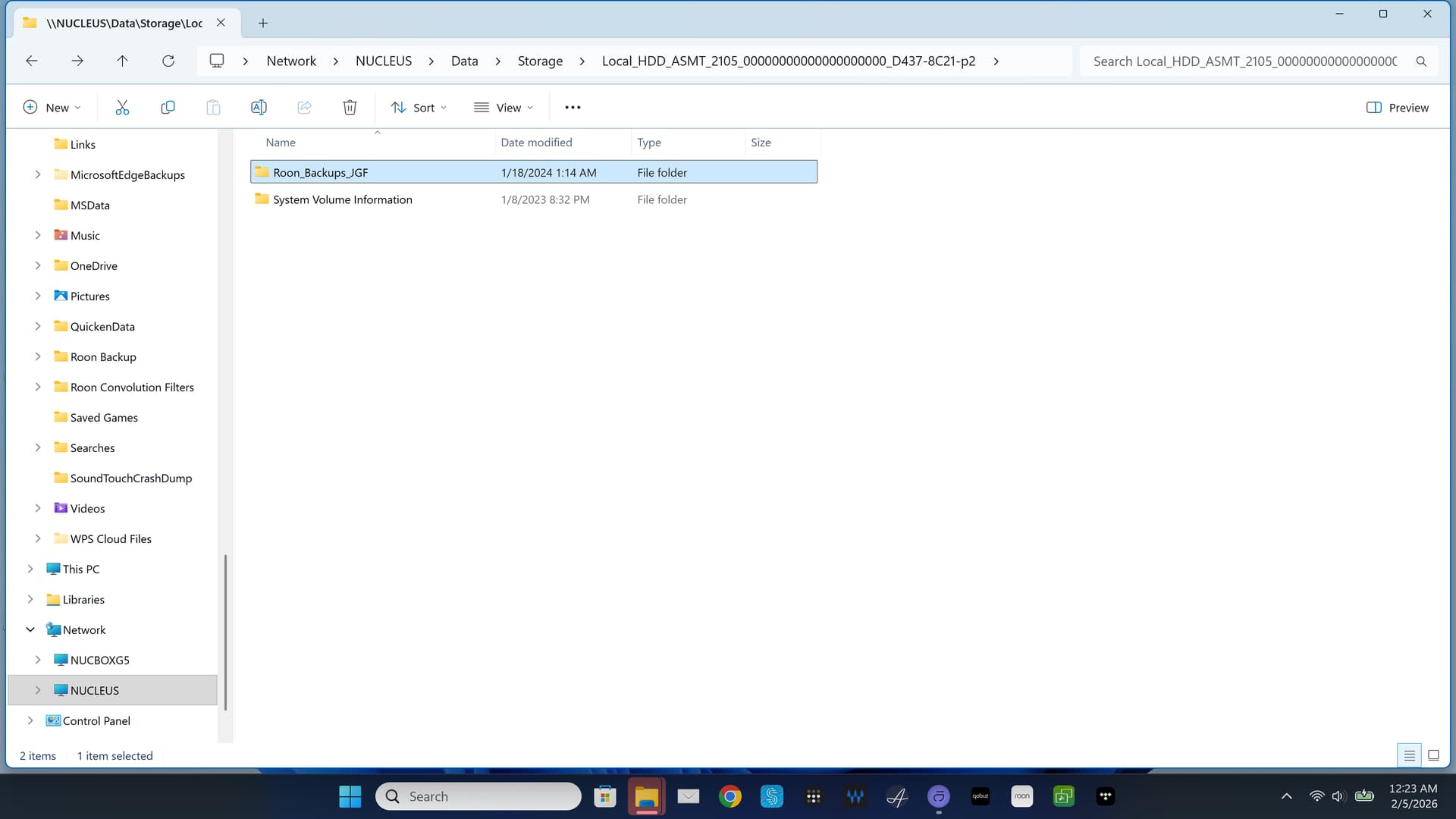 Here’s what mine looks like. I don’t recall exactly how I was able to find it in Windows Explorer, but it took a lot of clicking around to work my way to it. My drive is connected to my Nucleus with a USB cable. That’s the best way because your Nucleus will run 24/7 and automatic backups can occur in the middle of the night if you prefer.