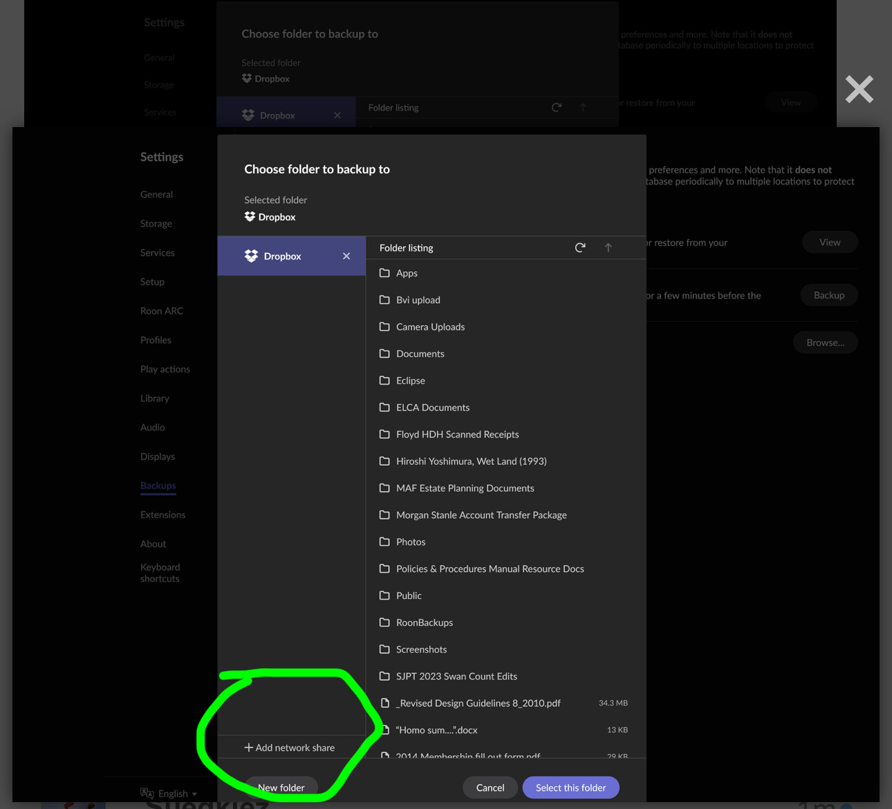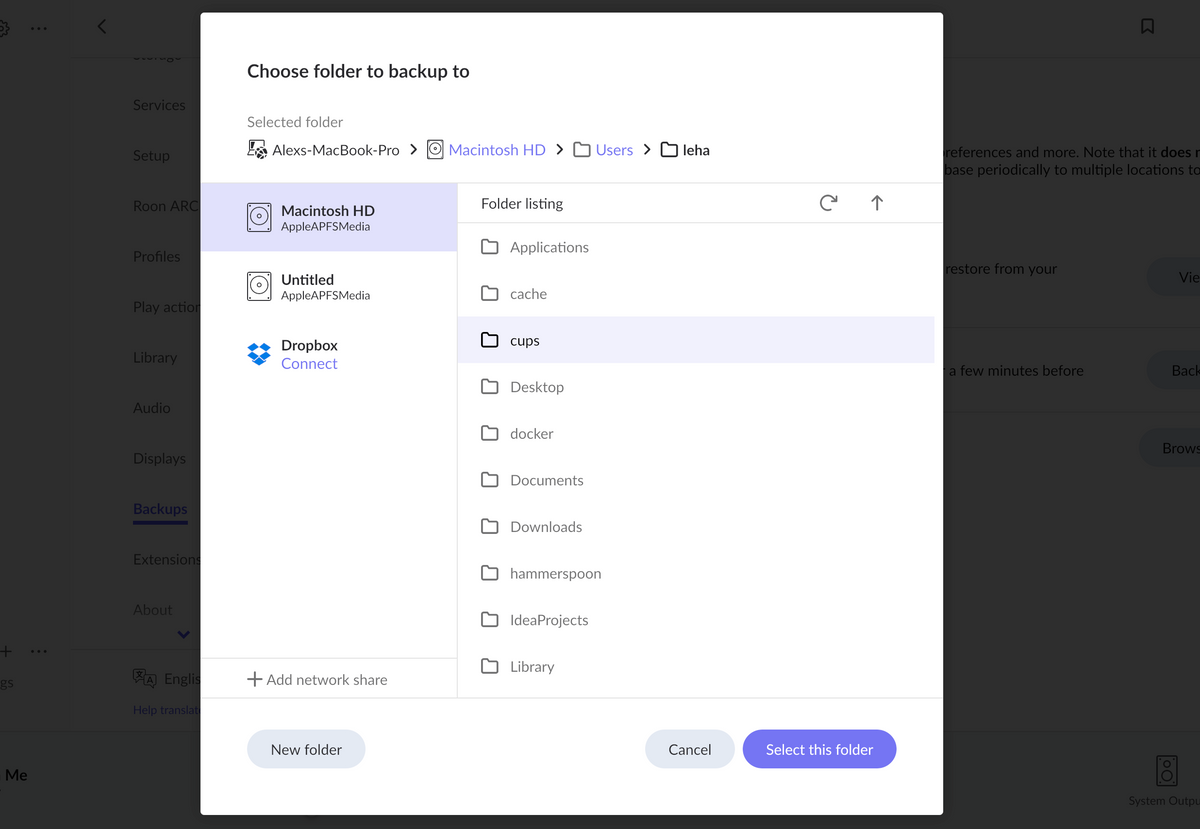 · When I Browse for a location to back up my Roon Database, all I see is Dropbox. I am already backing up to Dropbox. I have an external storage device plugged into my MacBook Pro Laptop, but Roon does not recognize it. How do I make Roon see the giant empty and unused storage device that is just waiting to be filled with backups?