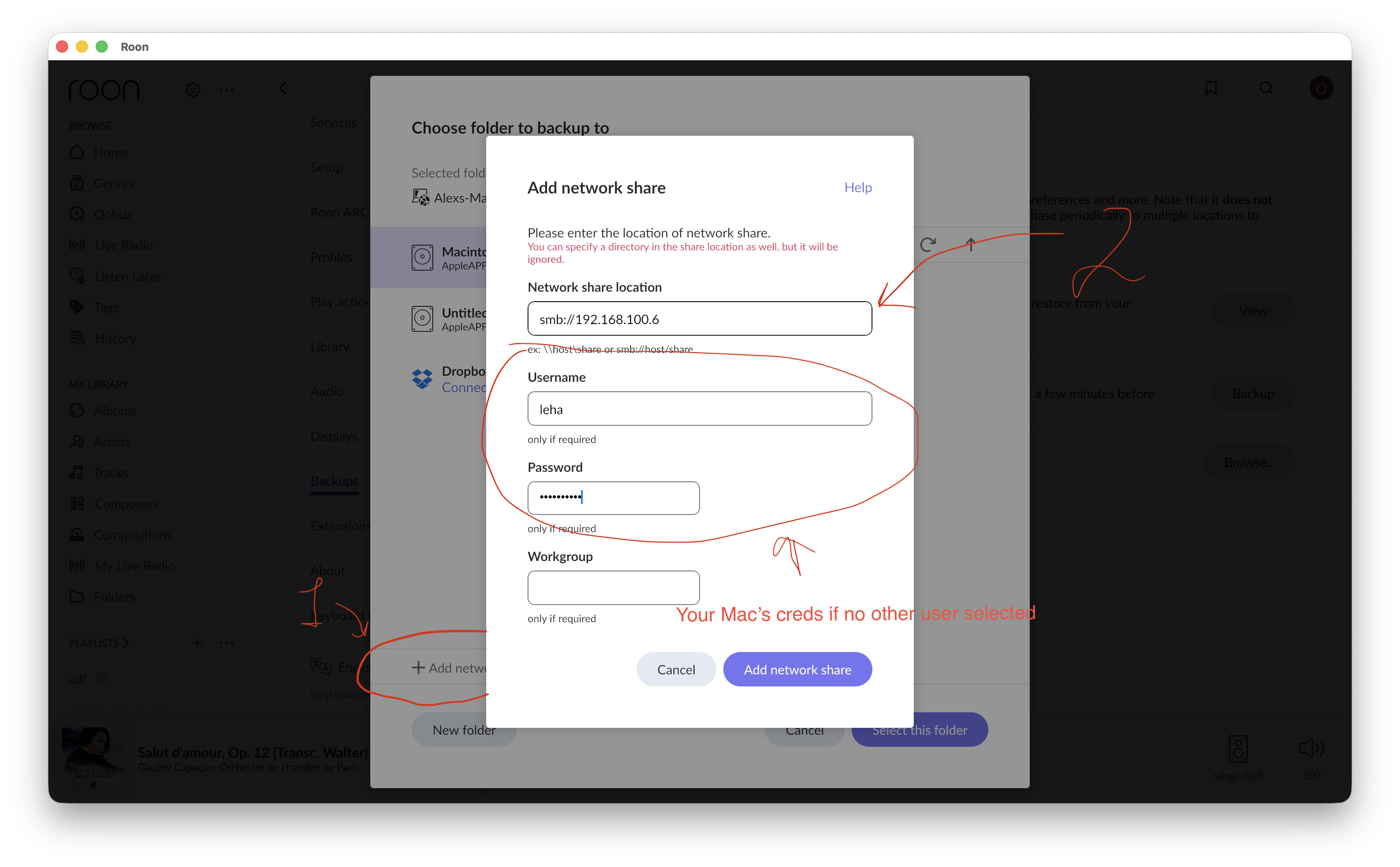 Please share a screenshot of the screen in Roon where you are entering the Network Path and credentials.