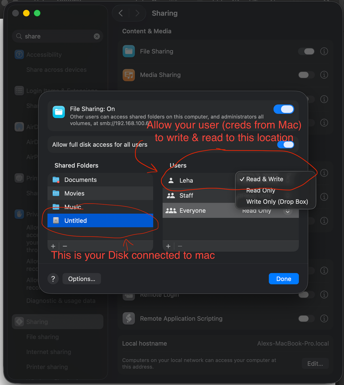 Please share a screenshot of the System Settings > General > Sharing > File Sharing window on your Mac, specifically showing the folder you are trying to share and the user permissions assigned to it.
