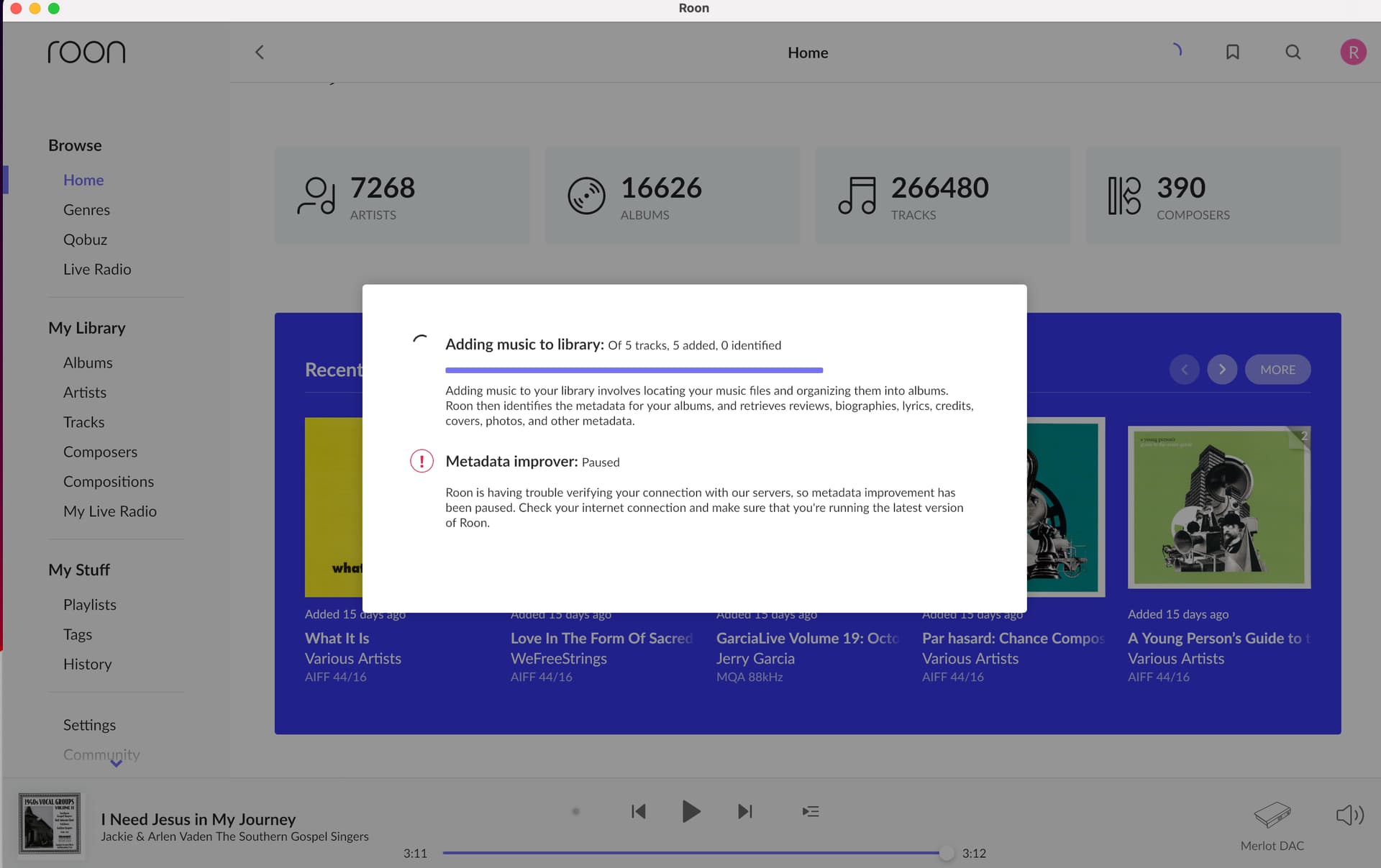 After several reboot attempts over a couple of days I did finally get Roon core recognized on network and logged back in to Qobuz on May 13 and it seemed to have recognized and re-processing my music tracks but Metadata improver was paused. (See Screen Shots 1-3)